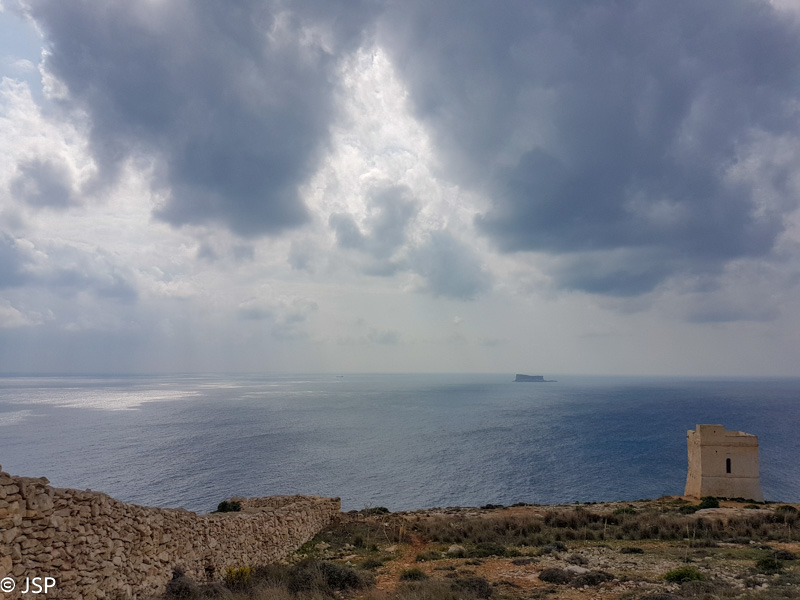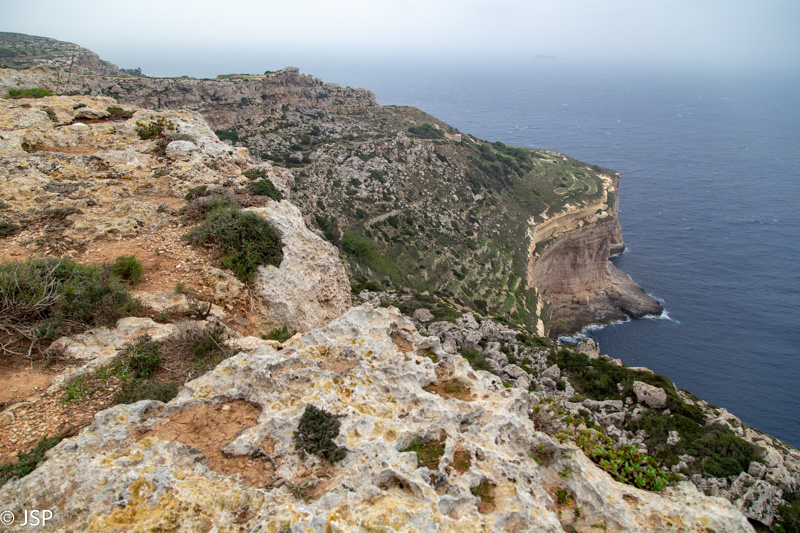 Pasiekę Dingli uolų ruožą, pirmiausia stojame prie kuklios akmeninės koplytėlės. Nuo siauros aikštelės už koplyčios atsiveria vaizdai į uolėtą pakrantę. Saulėtą dieną čia turėtų būti labai gražu, šiandien gi viskas aplink pilka, o vėjas beveik plaukus nuo galvos rauna, tad ilgai neužtrunkame ir atsisakę minties pasivaikščioti skardžio pakraščiu vedančiu taku (dar vėjas nupūs!), važiuojame toliau šiaurės kryptimi.