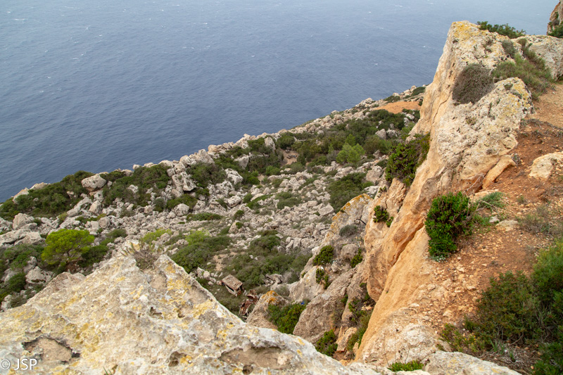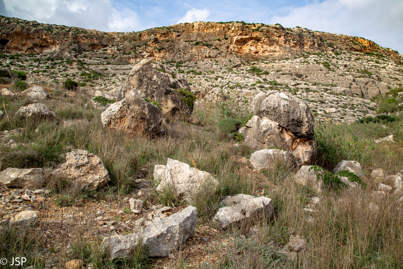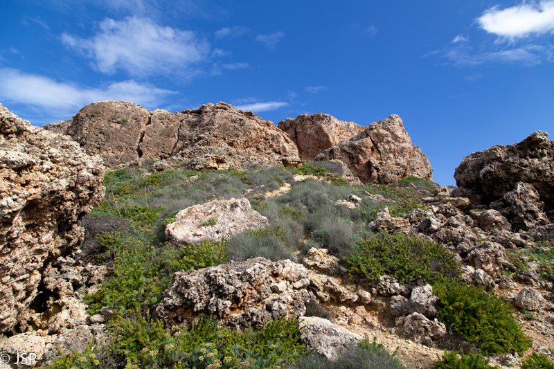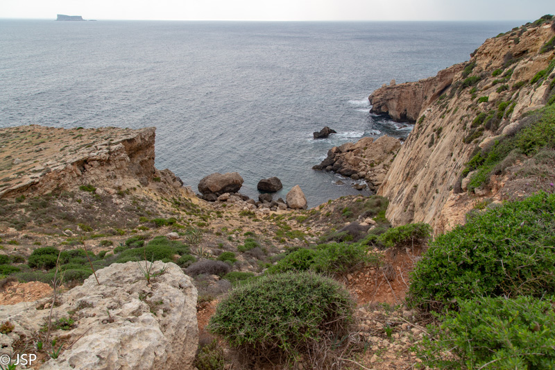 Siauras status takelis pagaliau atveda mus iki uolų papėdės. Uolos didžiulės, daug didesnės nei atrodė iš tolo. Apsidžiaugiame pamatę, kad yra takas aplink Ras il_Qarraba iškyšulį – būtnai juo eisime! Takas, beje, vienakryptis (prie uolų stovi kryptį rodantis medinis ženklas) ir tam yra rimta priežastis – į kairę sukantis takas virš Gnejna įlankos yra labai siauras, o skardis labai aukštas ir status. Prasilenkti tame take būtų ne tik sudėtinga, bet ir pavojinga. Jei atvirai, tai šita tako dalis man visai nepatinka, bet ji mūsų lauks tik pabaigoje.