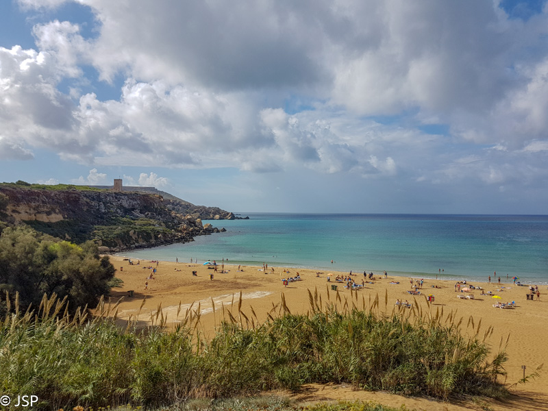 Penktadienis. Mūsų džiaugsmui, rytas išaukšta giedras ir šiltas. Aš norėčiau šią dieną paskirti Gozo salai, bet vyras jaučiasi prastai ir nenori taip toli važiuoti, tad renkamės kompromisinį variantą – važiuojame į Golden Bay įlanką šiaurės vakarų pakrantėje. Iki įlankos apie 40 minučių kelio, eismas, kaip įprasta Maltoje, labai intensyvus, vairuotojai ne visi laikosi taisyklių – vairuojančiam tikrai yra ką veikti. Bet vis dėlto su mašina Maltoje tikrai paprasčiau, autobusu mes tiek nebūtume pamatę, ypač kad nemėgstame skrupulingai planuoti ir dažnai keičiame savo planus paskutinę minutę.