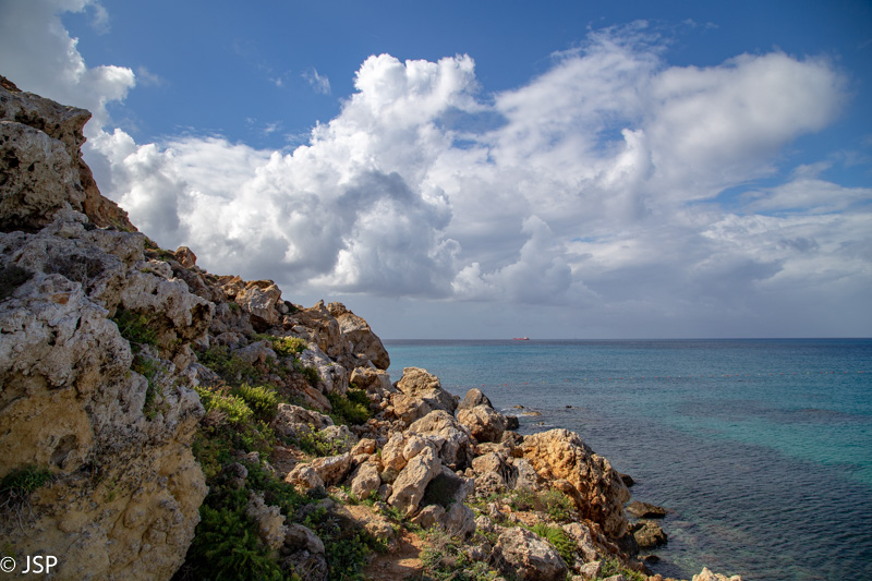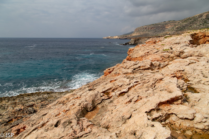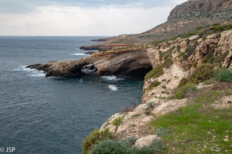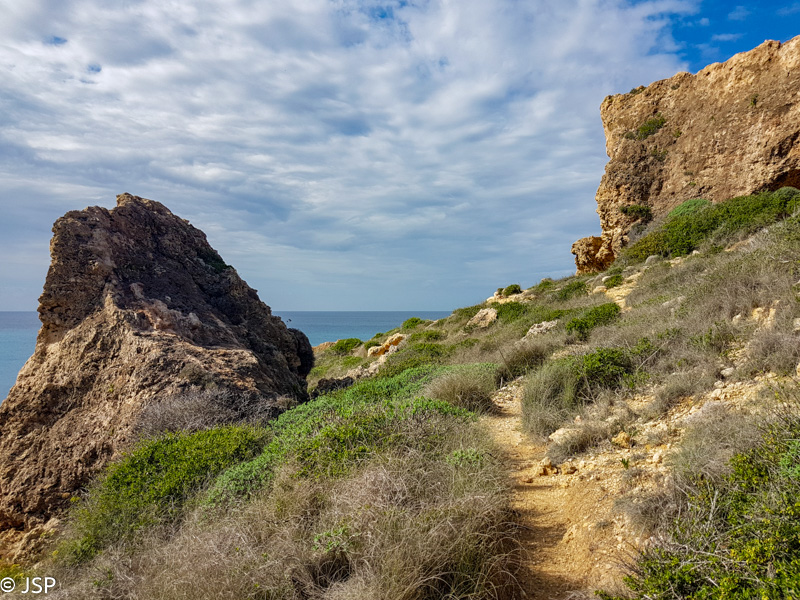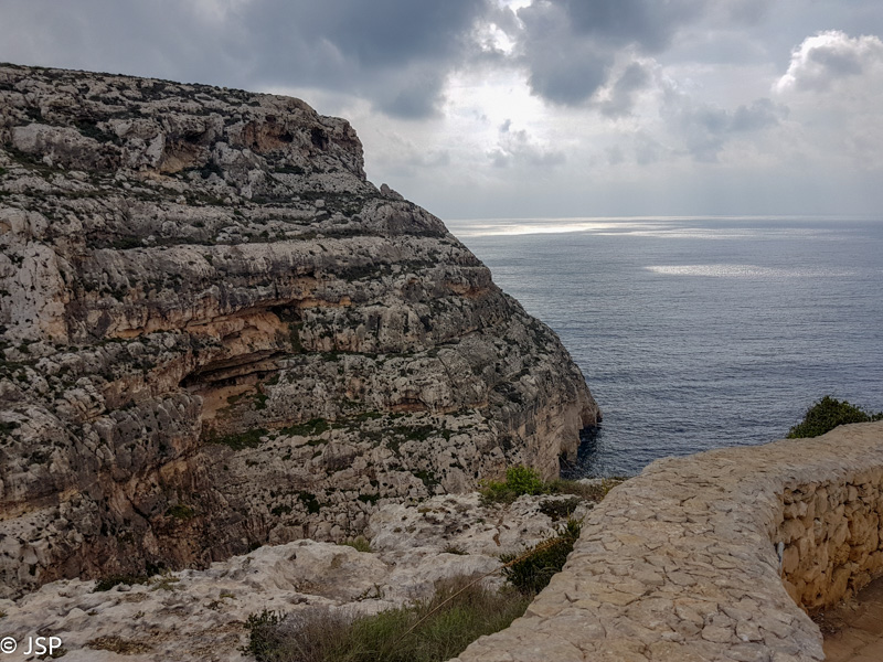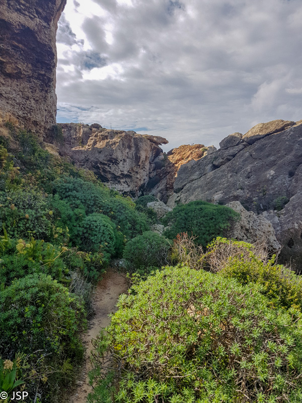 Pietaudama maps.me programėlėje aptikau Ghar Lapsi pakraštyje prasidedantį pakrantės taką, vedantį iki pat Ghar Hanex arkos (mes šį rytą tikrai pasirinkome patį sudėtingiausią būdą ją pasiekti!). Kadangi jokių kitų planų šiai popietei neturime, o debesys tuo tarpu kiek prasisklaidė, einame pasivaikščioti. Takas labai vaizdingas, gaila tik, kad diena tokia apniukusi: saulės nušviestos pakrantės uolos atrodytų daug gražiau. Bet gerai jau ir tai, kad nelyja.