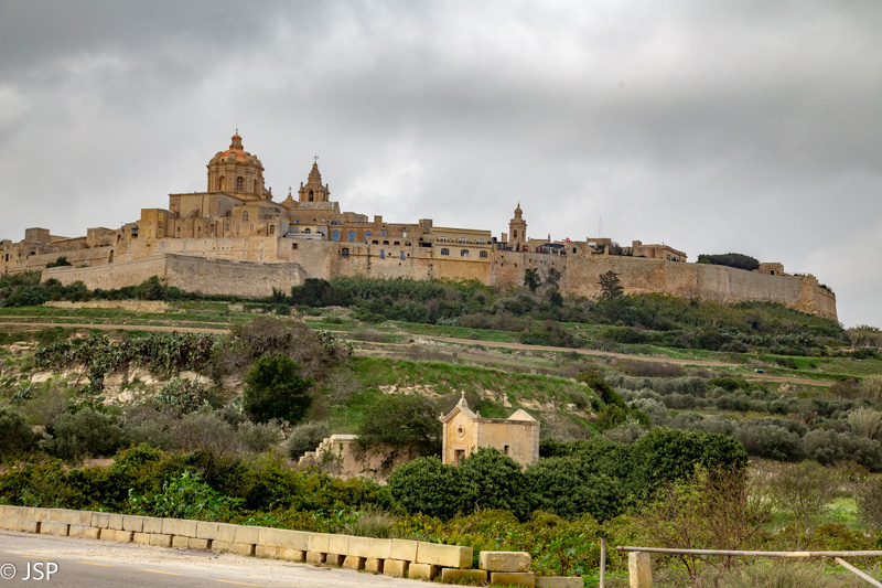 Artėjant prie Rabato, nuo kelio atsiveria vaizdas į aukštomis sienomis apsuptą senąjį miestą – tvirtovę, Mdiną.