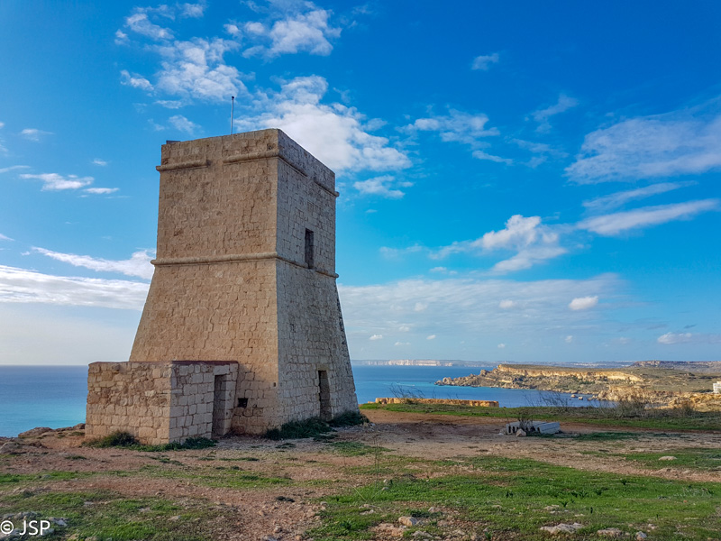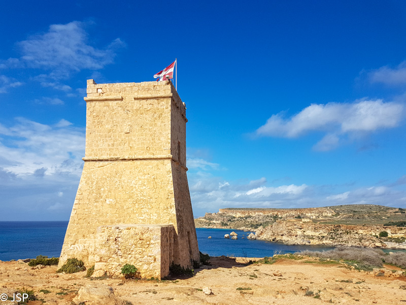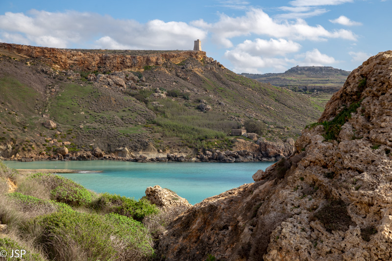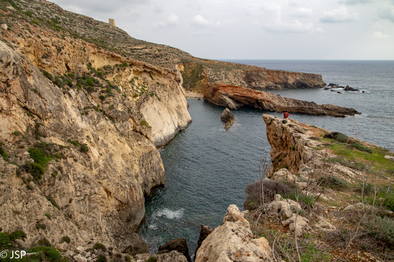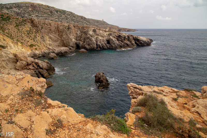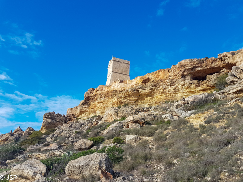 Mano maps.me programėlė rodo, kad iš pliažo turėtų būti takas aukštyn, kur ant skardžio stovi dar vienas sargybinis bokštas, Ta’ Lippija. (Yra ir asfaltuotas kelias, bet juo eiti nenorime – neįdomu, o ir atstumas didesnis.) Taką randame tik iš kelinto karto, nes jo pradžia labiau primena žvyro nuošliaužą, bet šiaip ne taip užsiropščiame tuos pirmuosius metrus ir netrukus išeiname į geresnį taką. Kopti tenka labai stačiai, bet vaizdai vis gražėja.