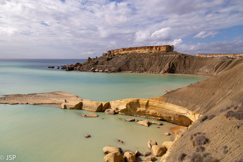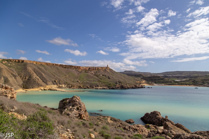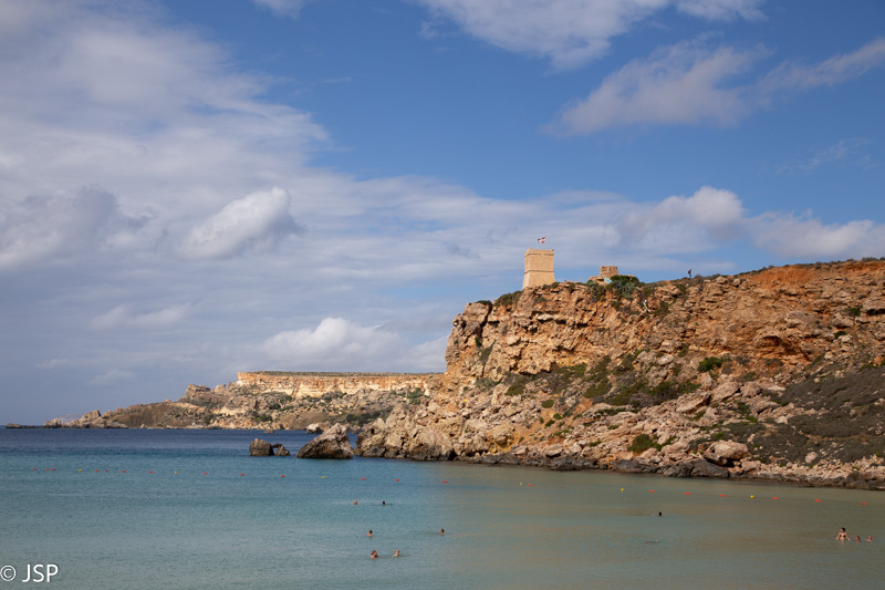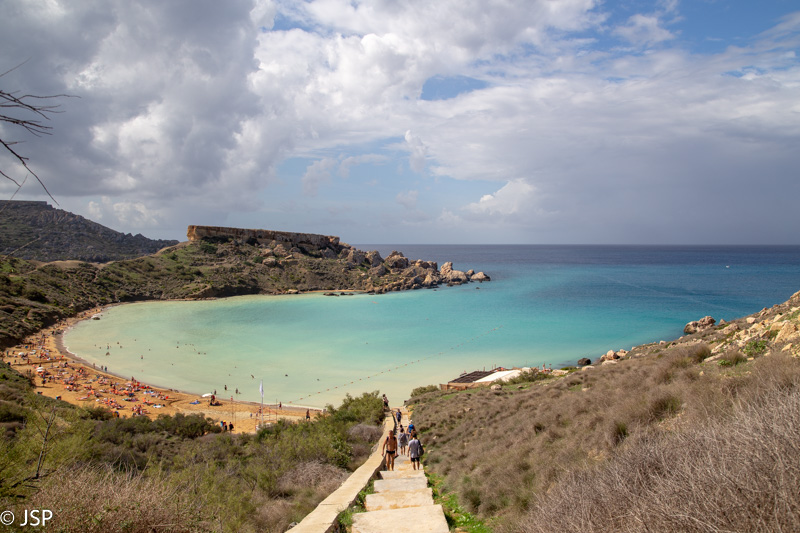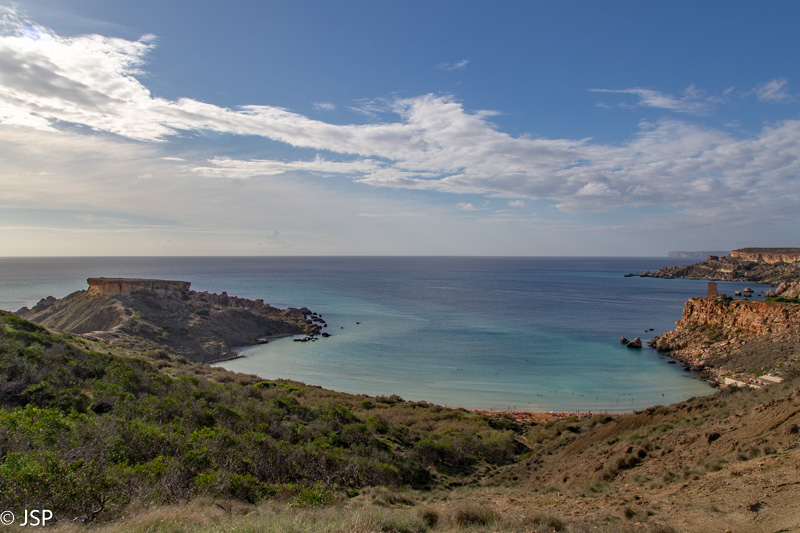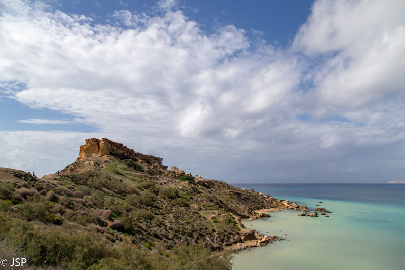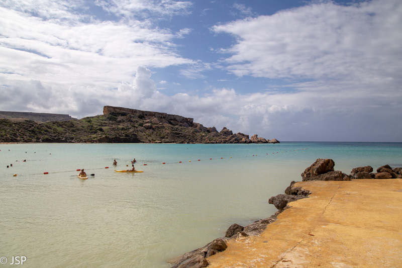 Kai nusileidžiame į Ghajn Tuffieha įlanką, jau laikas pietums. Pliažo pakraštyje yra jauki kavinukė, joje ir prisėdame. Maitina čia visai skaniai, personalas draugiškas – labai smagi viečiukė su vaizdu į įlanką. Mano žvilgsnis vis grįžta prie iškyšulio kitoje įlankos pusėje. Jo viršuje stūkso įspūdingai atrodanti uolų siena – labai norisi ją pamatyti iš arčiau.