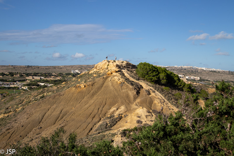 Bet pasirodo, iššūkiai dar nesibaigė. Kažkur virs Ghajn Tuffieha įlankos takas stačiai leidžiasi žemyn, o paskui vėl kyla ir sukasi aplink nedidelį kalniuką. Galima būtų ir į viršūnę užkopti, bet nieko labai kitokio nuo ten nepamatysim, tad einam lengvesniu taku aplinkui. Dar po kelių minučių pasiekiame Ghajn Tuffieha pliažo parkingą, o nuo čia jau visai netoli iki keliuko, kur palikome mašiną.
