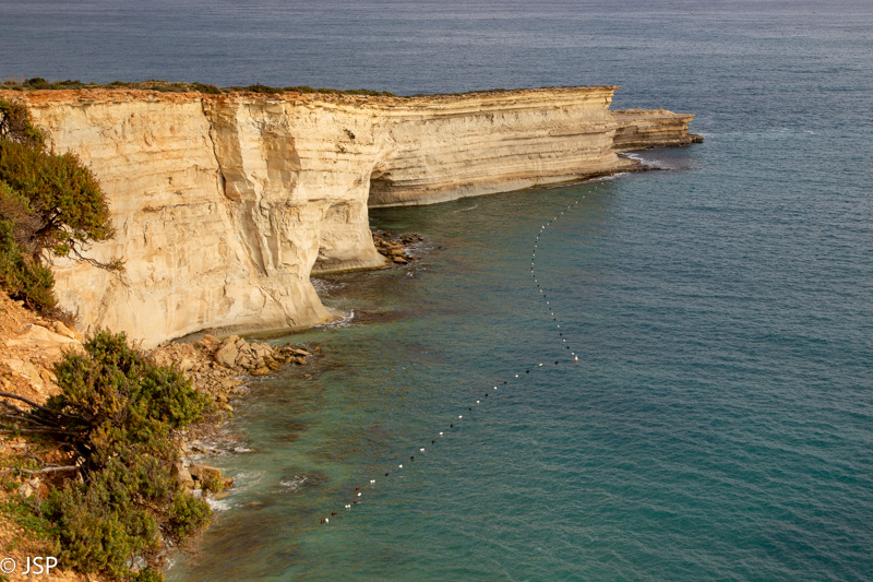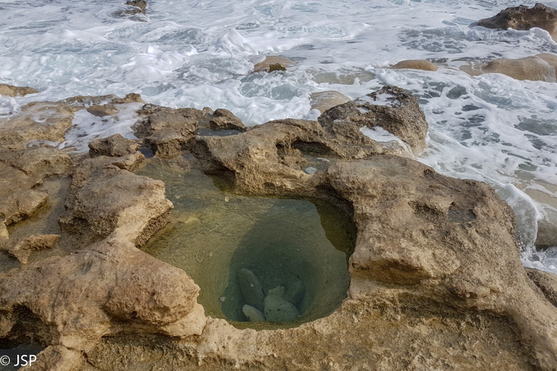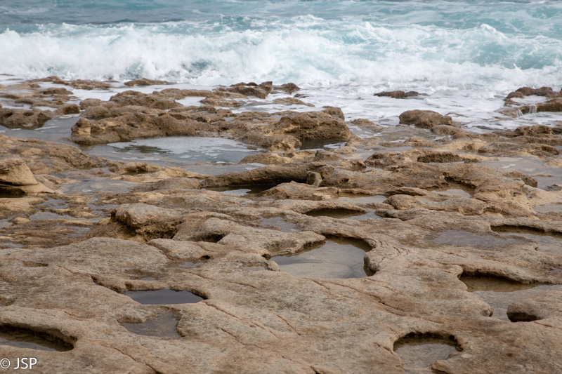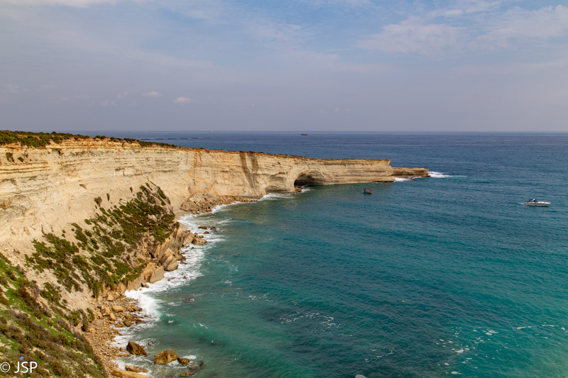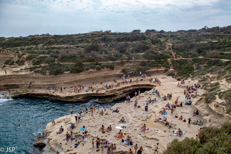 Papietavę vienoje iš Marsaxlokk kavinukių (spūstis baisinė, vos radom laisvą staliuką ir laukti teko ilgai) svarstome, ką veikti toliau: grįžti tiesiai į Marsaskalą ar pasukti iš kelio ir patyrinėti Delimara pusiasalį. Galiausiai nusprendžiam apžiūrėti bent jau St Peter‘s Pool – populiarią maudynių vietą už poros kilometrų. Krantinėje siūlomos ekskursijos laiveliu, bet mes renkamės eiti pėsčiomis – ir pamatysime daugiau, ir daugiau laisvės turėsime nei laiveliu plaukiant. Einame beveik valandą. Trasos pradžia nelabai įdomi: akmenuotas takas aukštyn tarp dirbamų laukų ir apšepusių pastatų, bet išėjus į pakrantę reikalai pagerėja. Paskutinė atkarpa – aukštai virš įlankos su plačiais vaizdais.