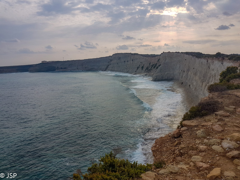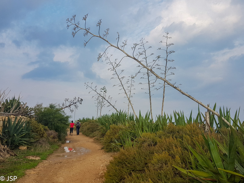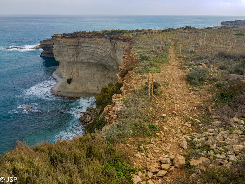 Atgal į Marsaskalą einame vaizdais dosniu pakrantės taku aukštai ant uolų, vieną po kitos apeidami tris įlankas. Takas nors ir gražus, bet laukiniams vakarų pakrantės takams visgi neprilygsta. Pakeliui dar ir lietaus gaunam – laimei, lyja neilgai ir nesmarkiai, nes dumblinais takais eiti nebūtų smagu.