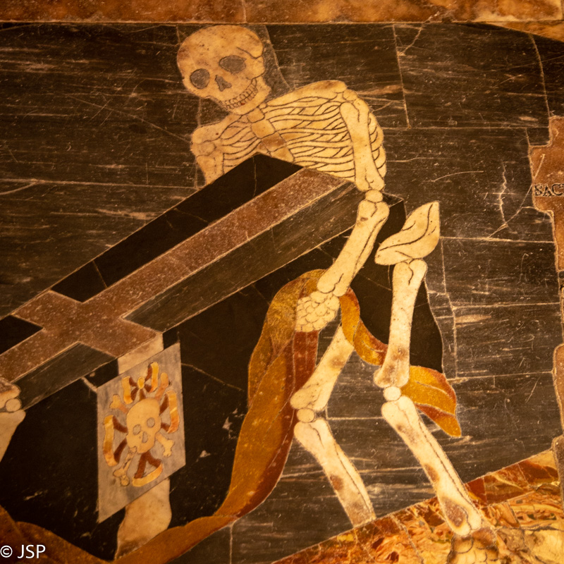 Marmurinės grindų plokštės vaizduoja gana makabriškas scenas.