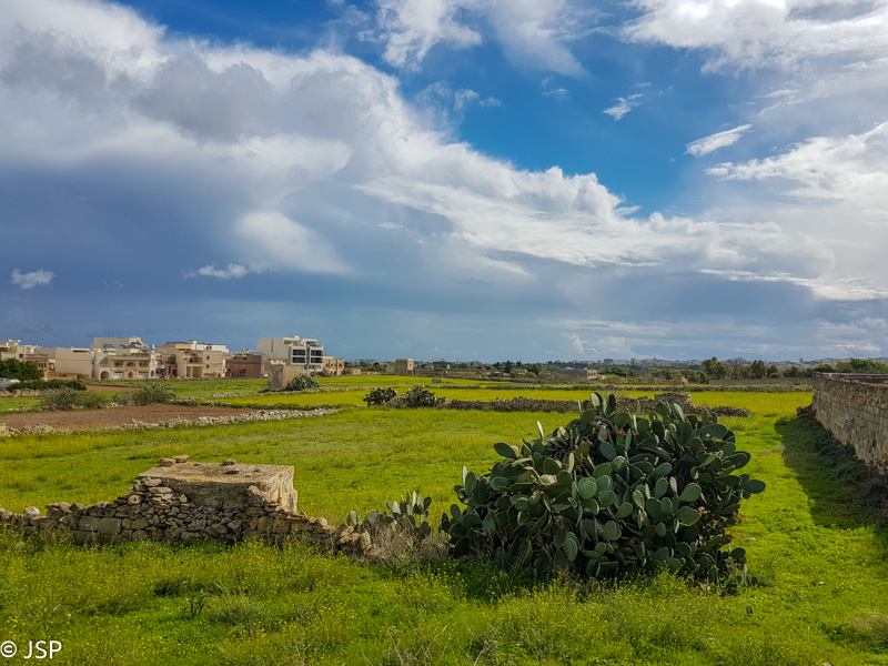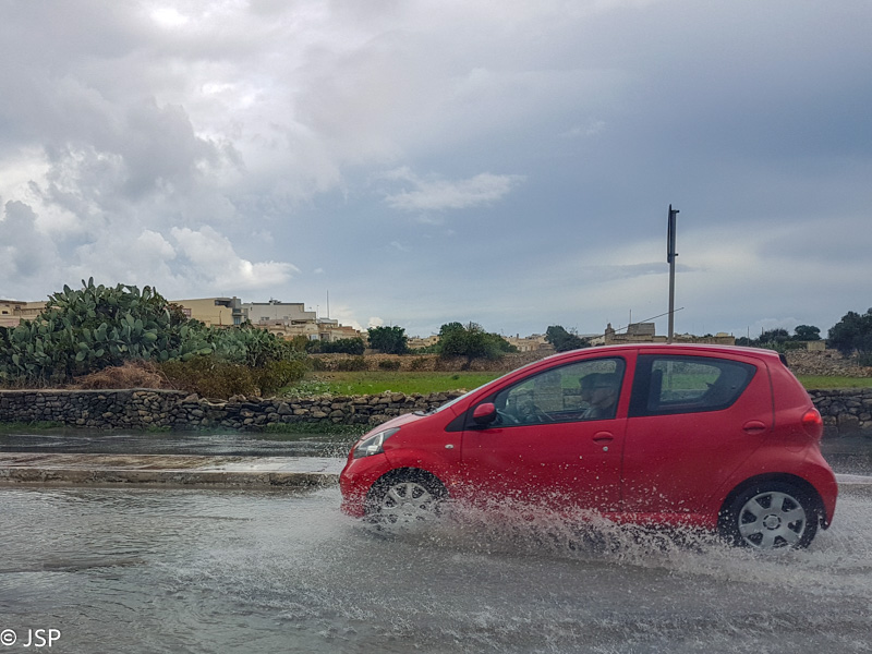 Takas turėtų mus nuvesti į Žurrieq miestelį, bet eilinį kartą neradę trasos ženklo, nusukame ne į tą pusę ir tik po pusvalandžio susigaudome, kad grįžome į Qrendi, nukirtę nemažą kampą ir smarkiai patrumpinę trasą. Grįžtame pačiu laiku, nes lietus atėjo anksčiau nei buvo žadėta. Paskutinius kelis šimtus metrų iki mašinos jau bėgame, o dar už kelių minučių, kai mes jau saugiai sėdim viduj, prasideda liūtis. Kelias tuoj pavirsta srauniu upeliu, valytuvai nespėja valyti langų, o mes džiaugiamės, kad lietus mūsų neužklupo kur nors vidury laukų, nes būtume peršlapę iki siūlo galo.