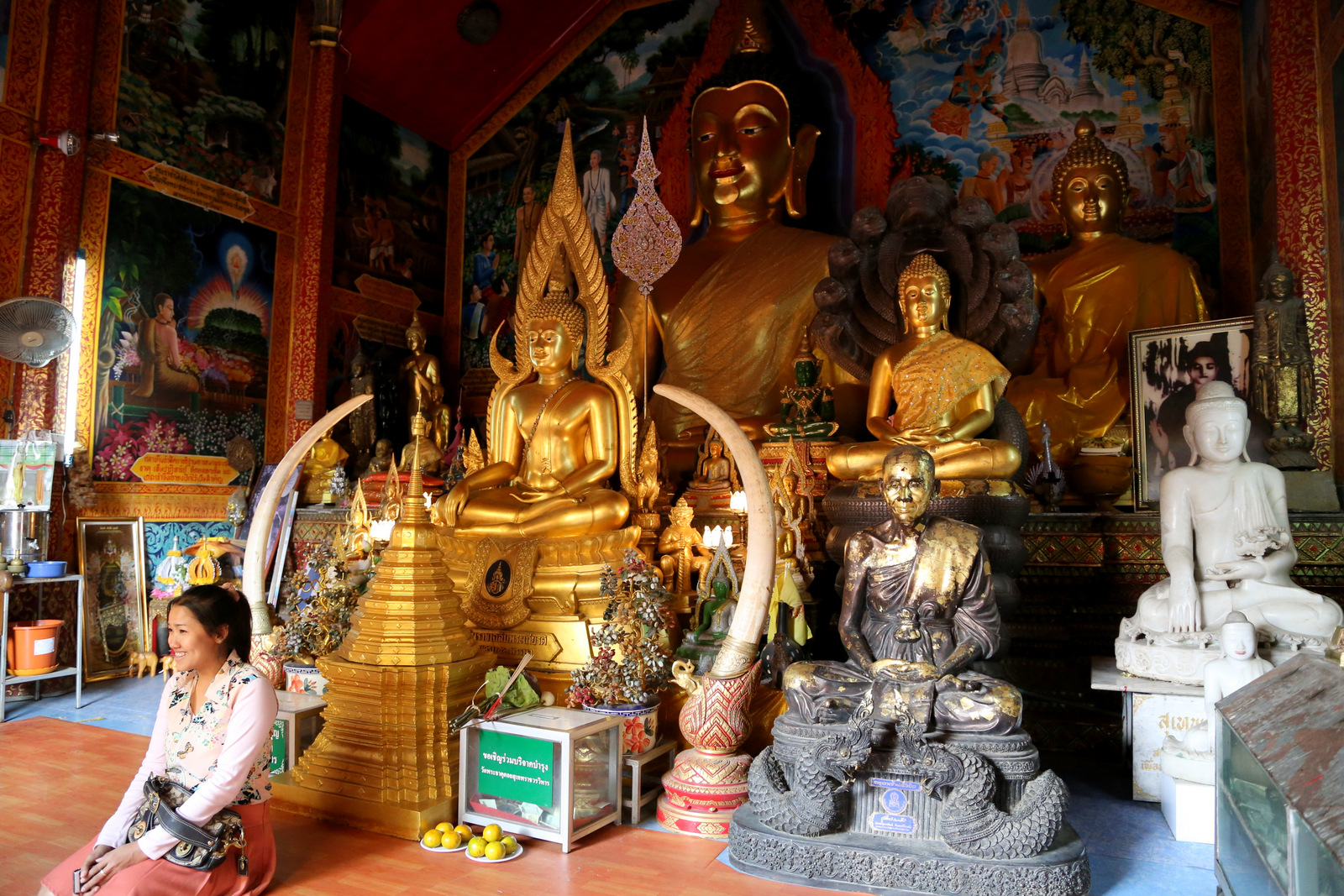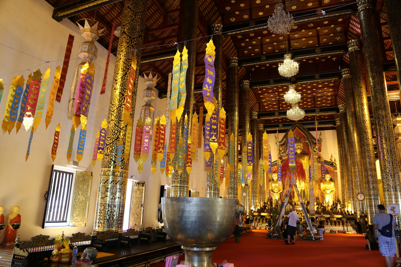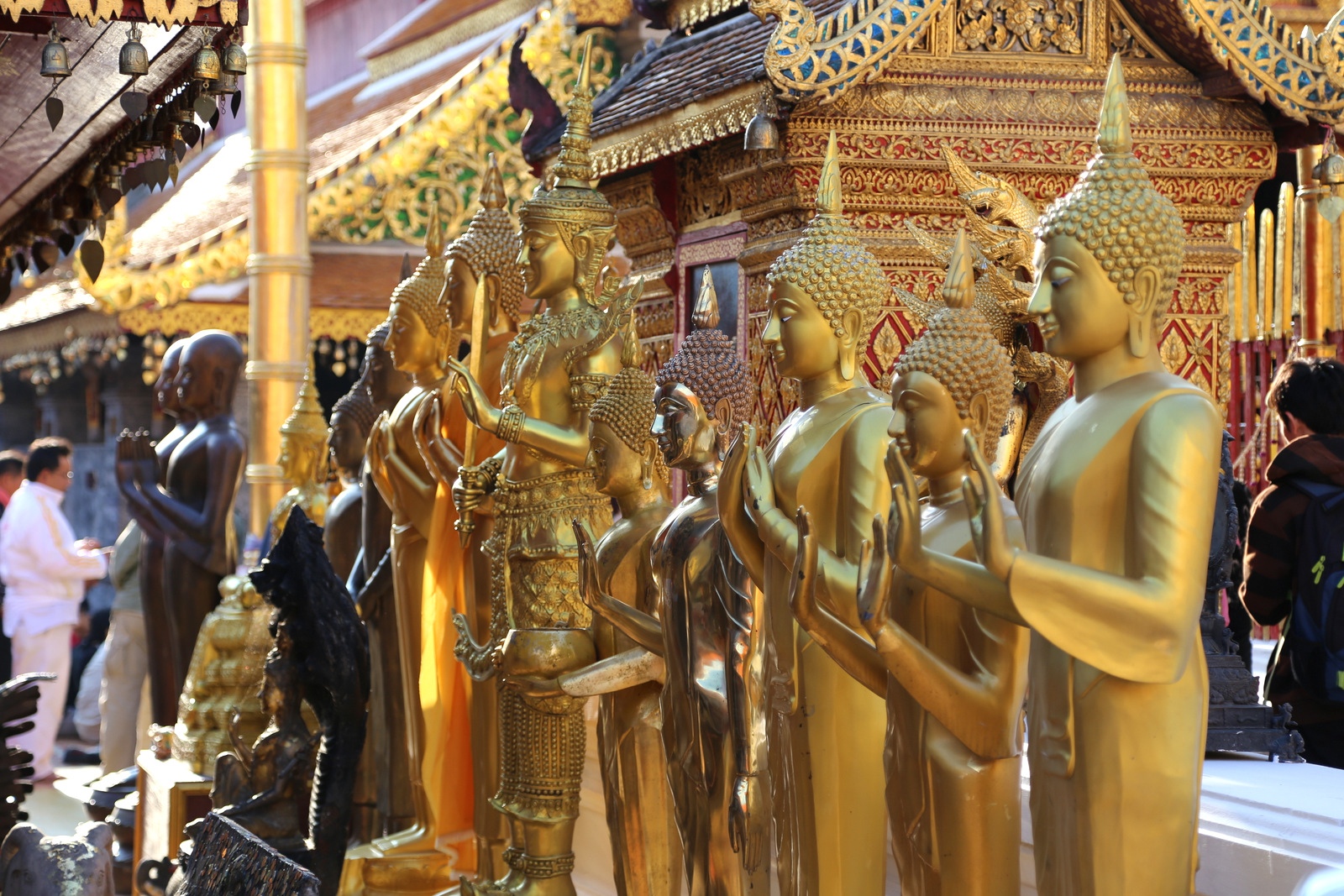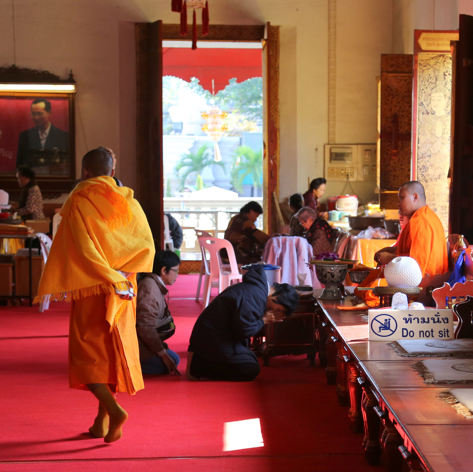 Šventykloje – tikras knibždėlynas. Vyksta pamaldos, žmonių prisirinkę gausybė, meldžiasi ir atskirose salėse, ir kiemeliuose, ir grupėmis, ir po vieną. Taip ir nesuprantam, ar šiandien kažkokia ypatinga šventė, ar čia kiekvieną šeštadienį tokia spūstis. Ir maloniai nustembam dėl budistų tolerancijos kitatikiams. Kai vyksta pamaldos krikščioniškoj bažnyčioj, turistai kaip taisyklė į vidų neįleidžiami, į musulmonų mečetes kitatikiams dažniausiai išvis draudžiama užeiti, Hindu šventyklose irgi yra visokių apribojimų, o į budistų šventyklas – maloniai prašom, net jei ir pamaldos vyksta, lankytojai jiems netrukdo.