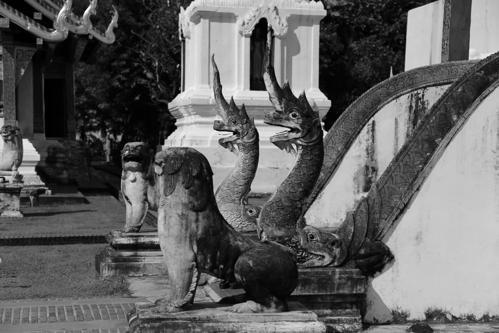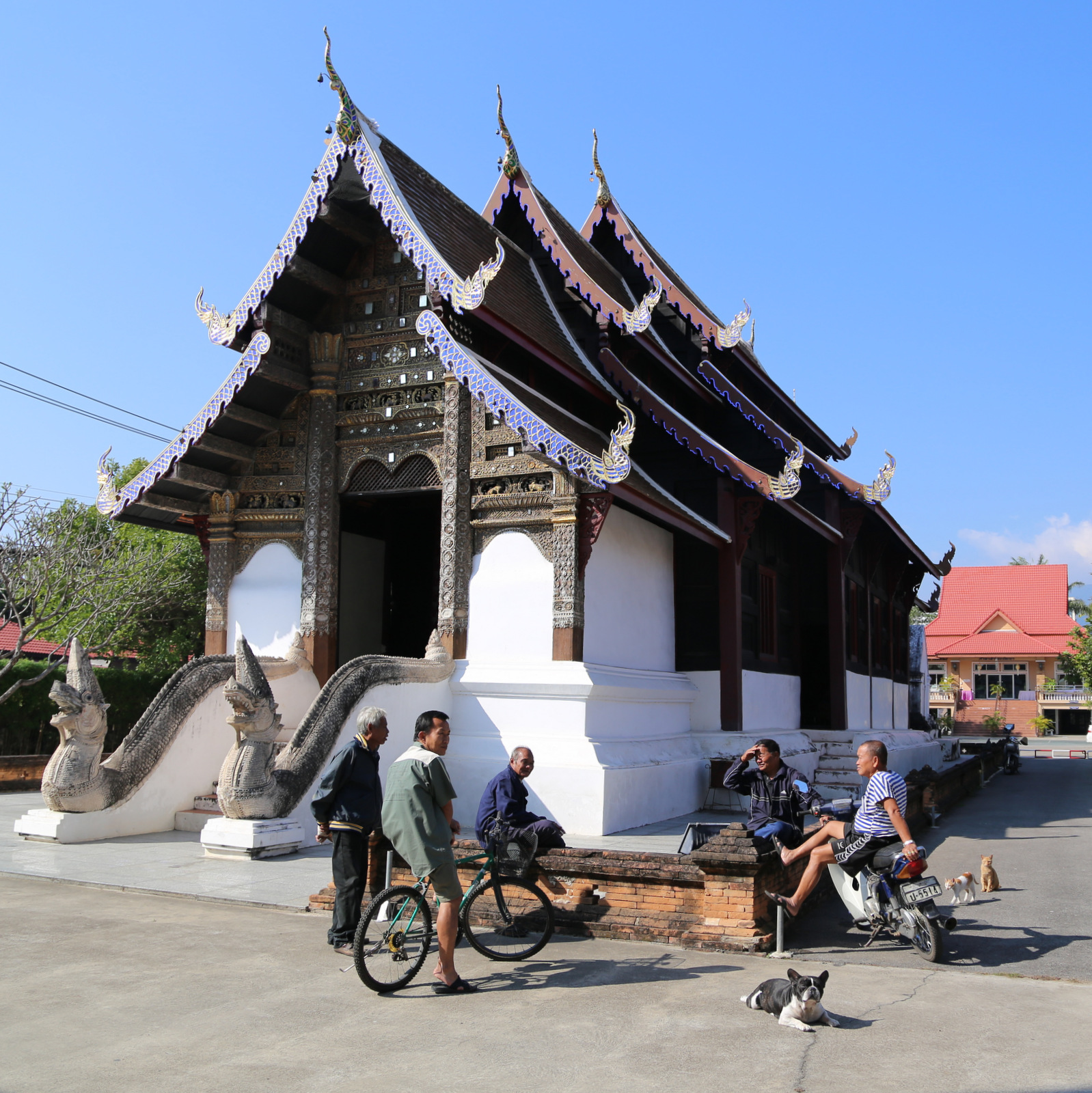 Vos už poros kvartal7nuo viešbučio yra dvi šventyklos, Wat Phra Singh ir Wat Chedi Luang, link jų ir einam tuščiomis apsnūdusiomis gatvėmis. Pakeliui dar užsukam į kažkokios bevardės šventyklos kiemą. (Pavadinimas buvo parašytas ant tvoros, bet mes dar neišmokom skaityti tajų rašmenų.)