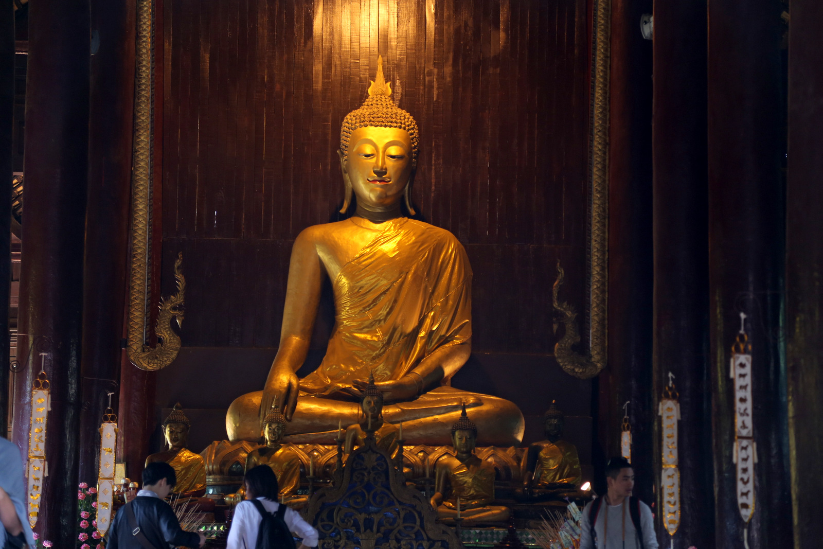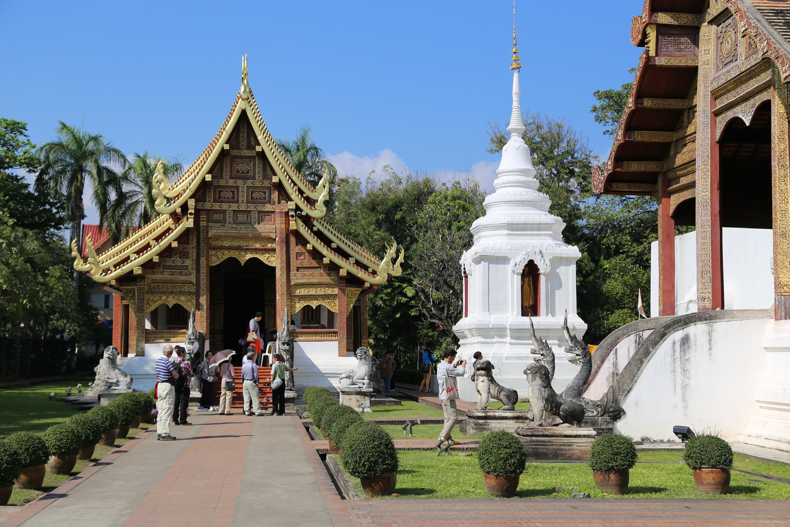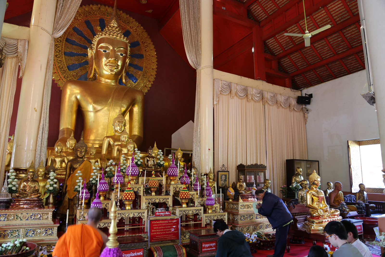 Wat Phra Singh šventykla – pati lankomiausia Chiang Mai. Didžiulėje teritorijoje išsimėčiusios kelios (o gal net keliolika, jau nepamenu) didesnių ir mažesnių šventyklų. Pirmiausia einam į pačią didžiąją. Fotografuoti galima, tik rekomenduojama tai daryti taip, kad fotoaparatas nežvelgtų į Budą iš viršaus – tai yra nepagarbos ženklas. Ir jau visai prastai, jei atsisėsite ant grindų prieš skulptūras ir atsuksite į Budą savo kojų pėdas. Sėdėti rekomenduojama lotoso poza, kad pėdos būtų saugiai nusisukusios į kitą pusę.