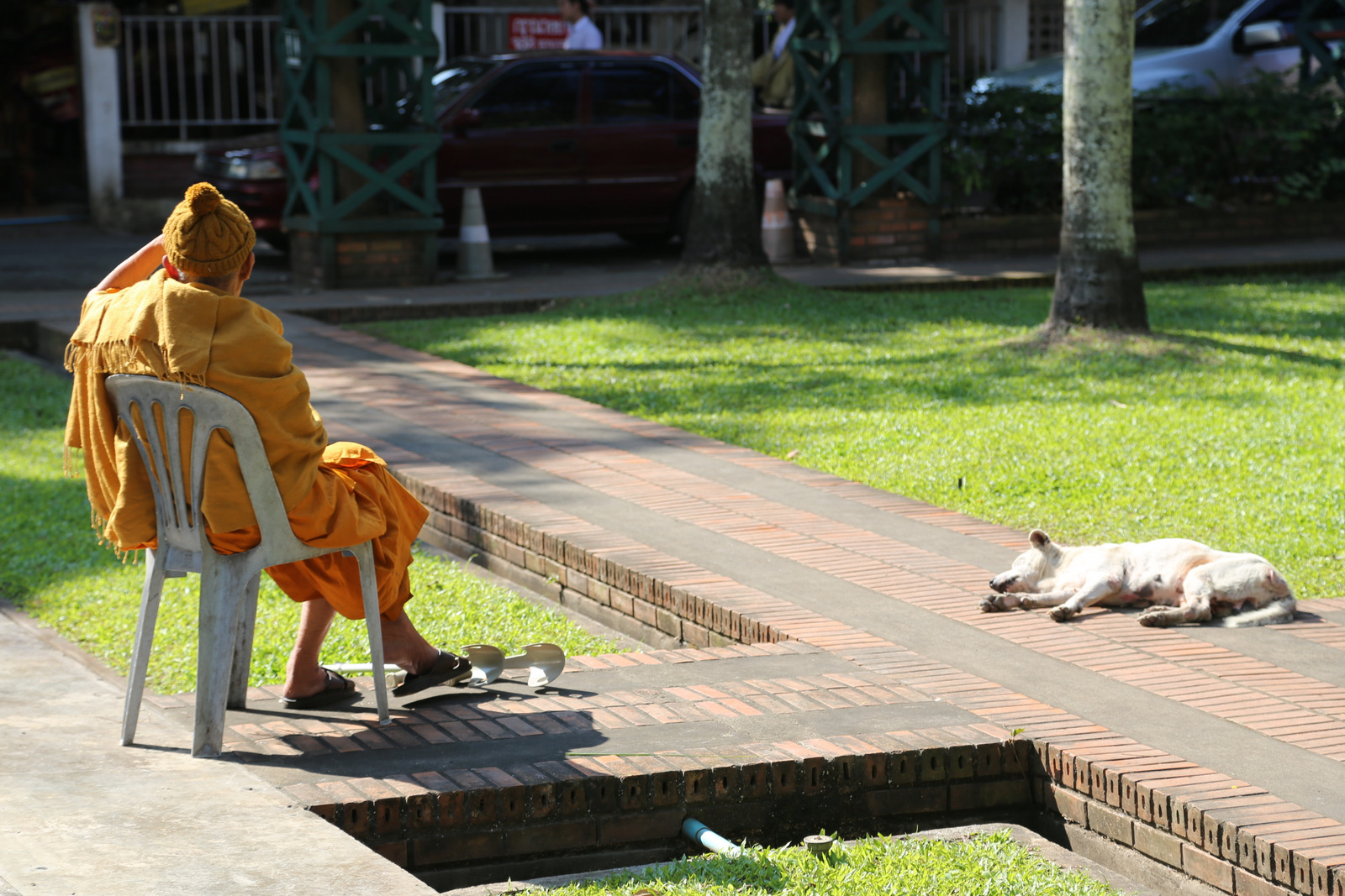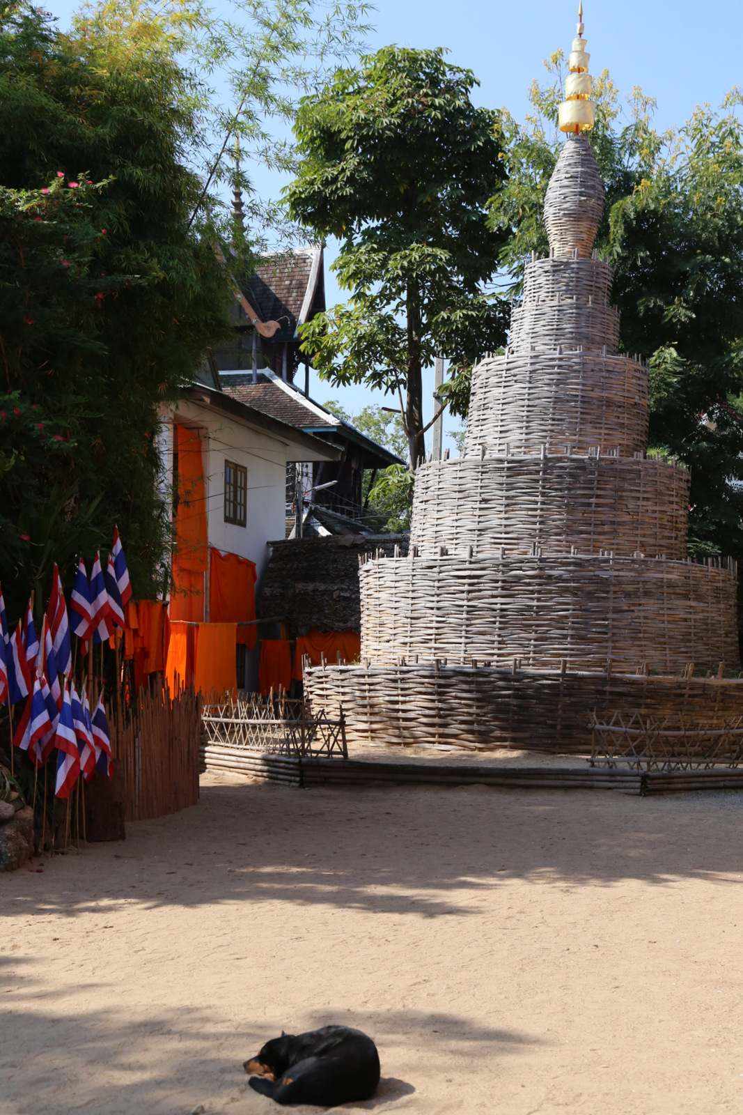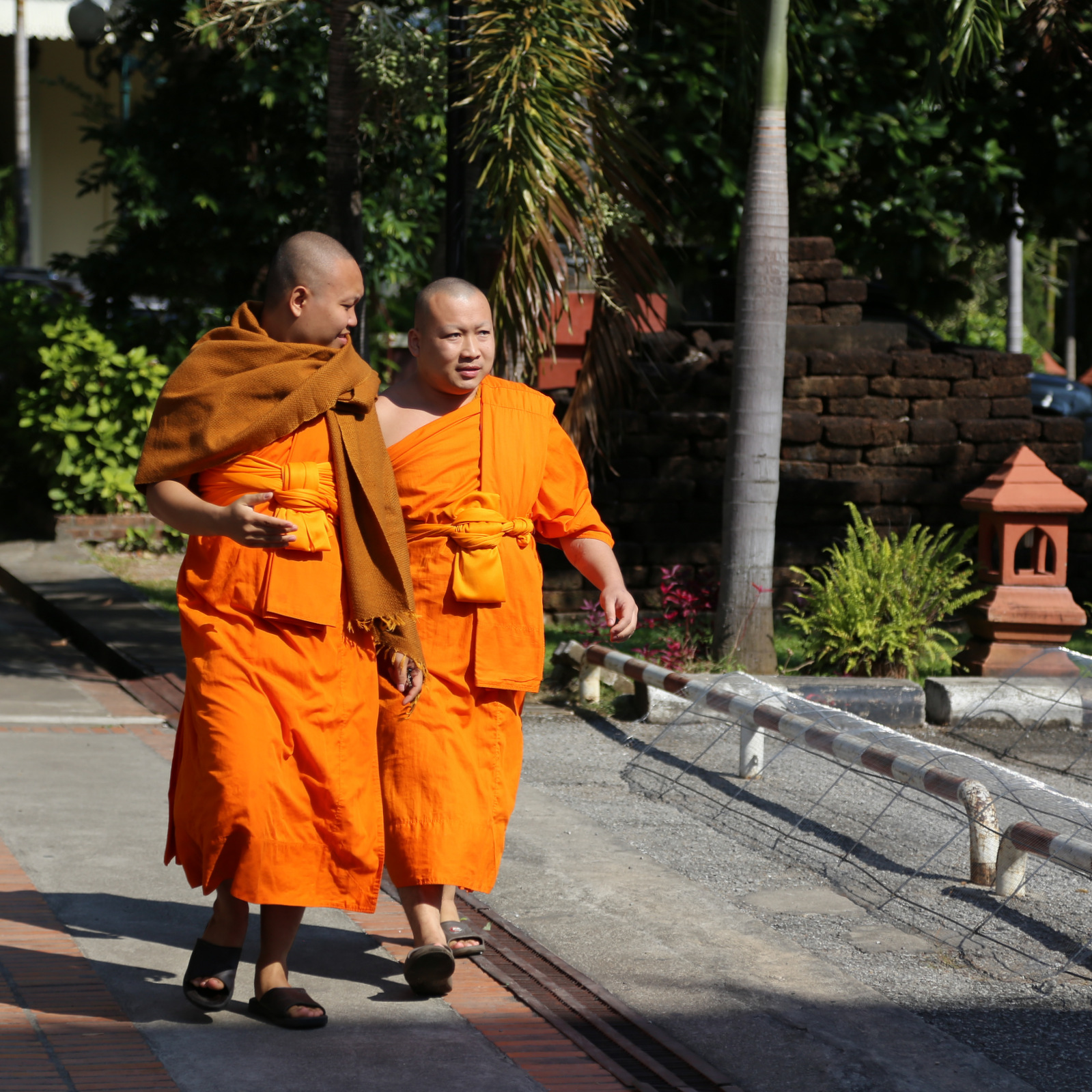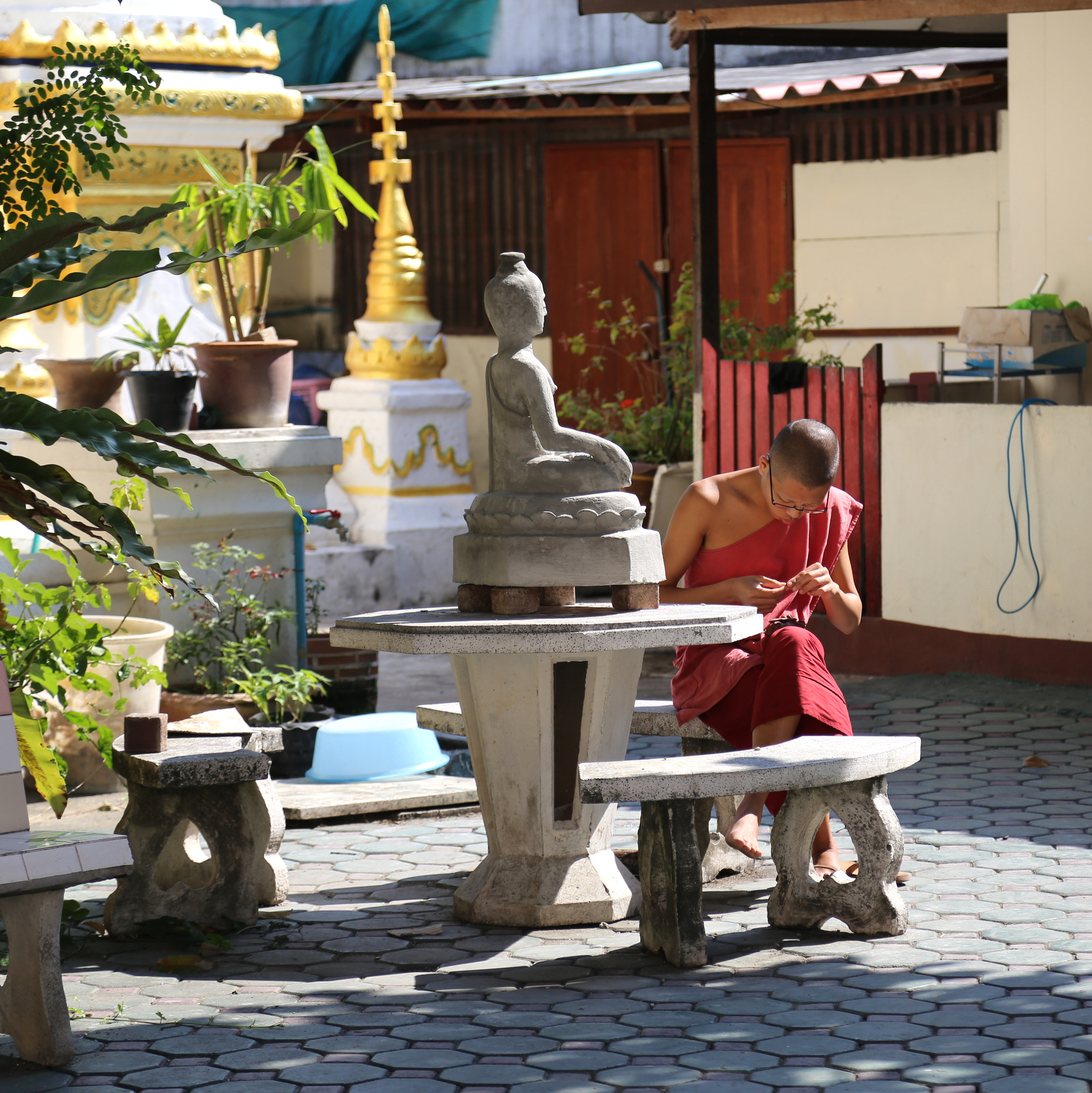 Už šventyklos, kiemo gale – vienuolyno pastatai. Tipiškas šių kraštų vaizdelis – ant tvoros džiūstantys oranžiniai vienuolių rūbai.