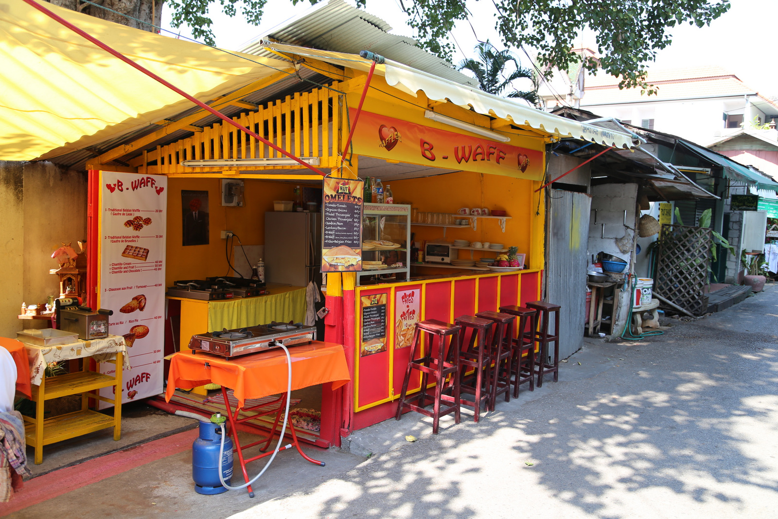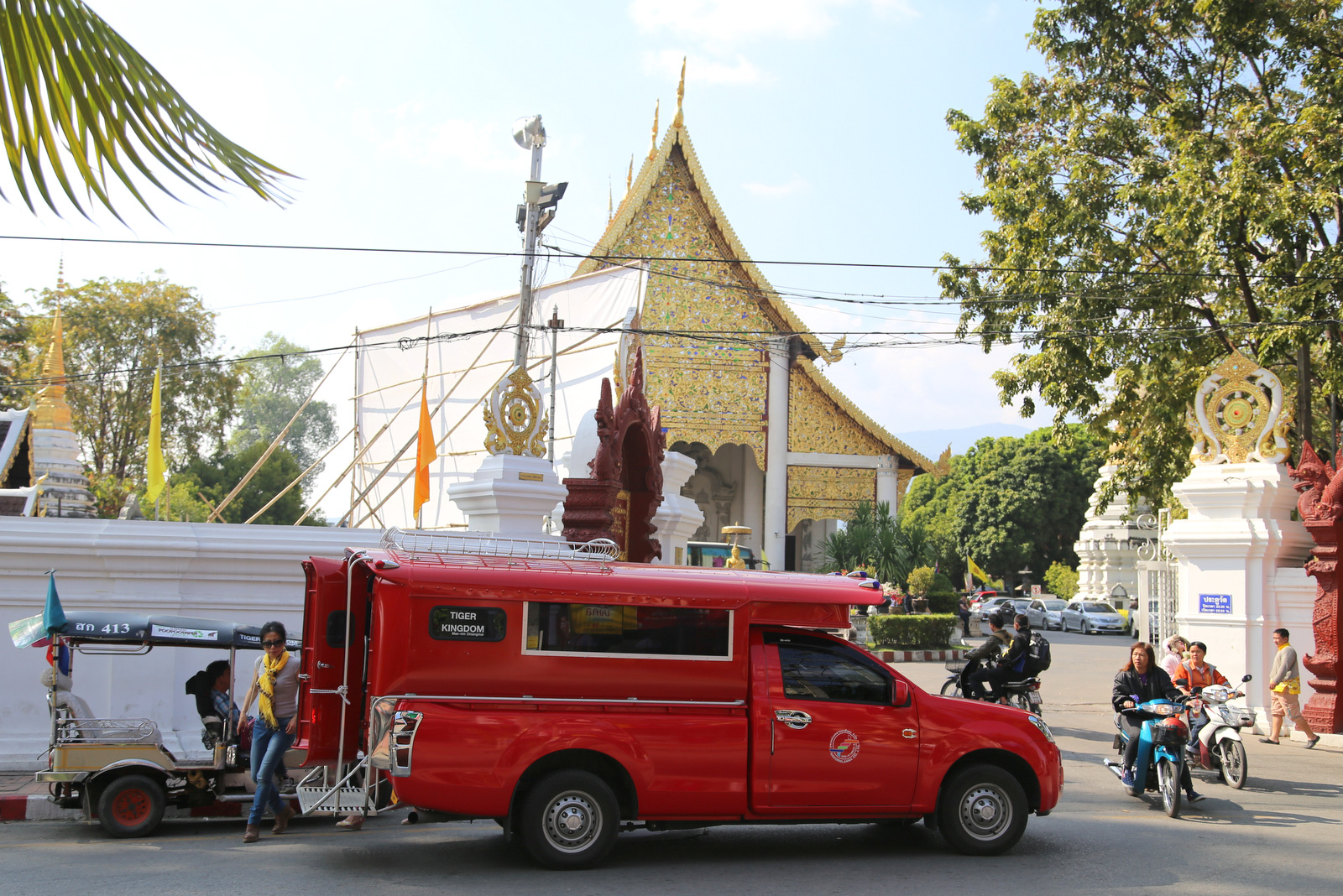 Tas raudonas autobusiukas – songthaew, populiauriausia Chiang Mai transport priemonė, sutalpinanti 8-10 keleivių ir dėl to gerokai pigesnė nei taksi ar individualus tuktukas.