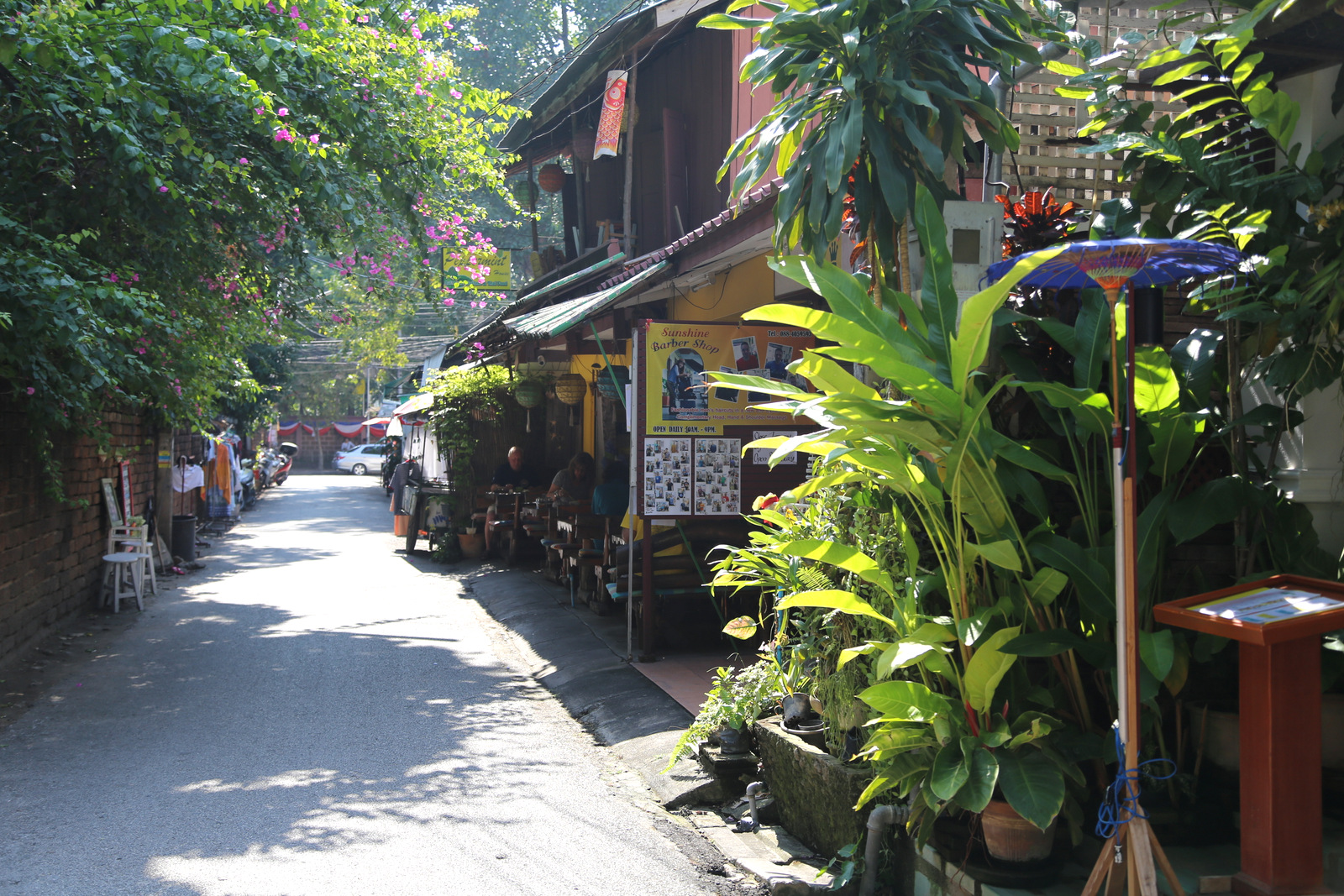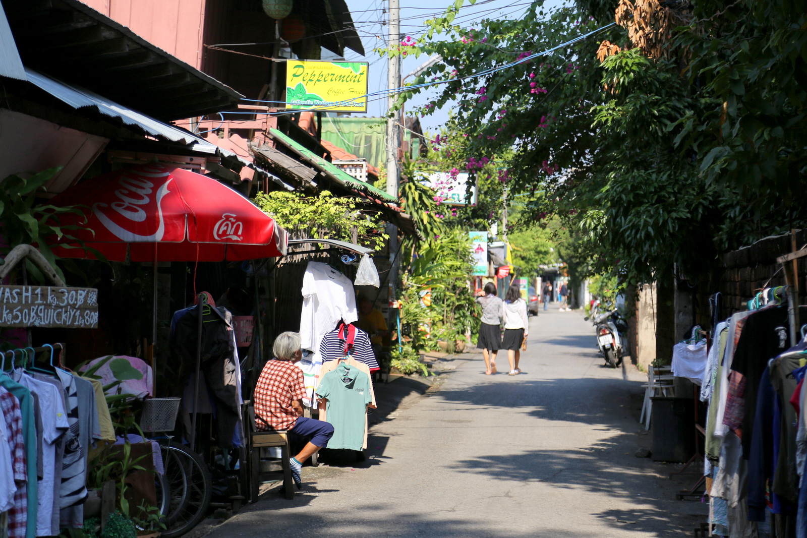 Pasisotinę šventyklomis, likusią ryto dalį praleidžiam tiesiog klaidžiodami po senąjį miestą. Chiang Mai – visai kitoks nei Bankokas. Jokių dangoraižių, jokio karštligiško skubėjimo, gyvenimo tempas čia daug lėtesnis. Gynybine siena apjuosta senoji miesto dalis – tikra ramybės oazė. Vešlioj žalumoj pasislėpusios šventyklos, siauros ūksmingos gatvelės, niekur neskubantys ir jokių must see objektų neieškantys atsipūtę turistai, prisėsti kviečiančios nedidelės jaukios kavinukės – puiki vieta atsipūsti ir be jokio plano tiesiog pabūti kelias valandas (arba ir kelias dienas, jei noro ir laiko yra).
