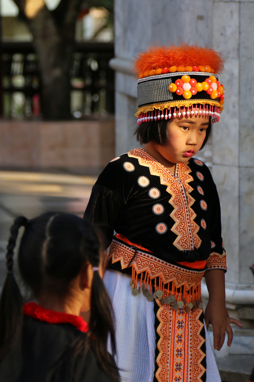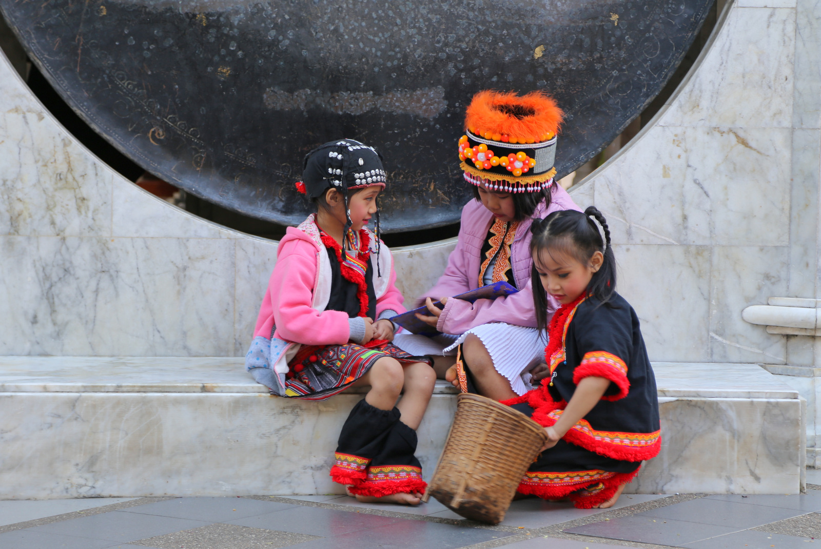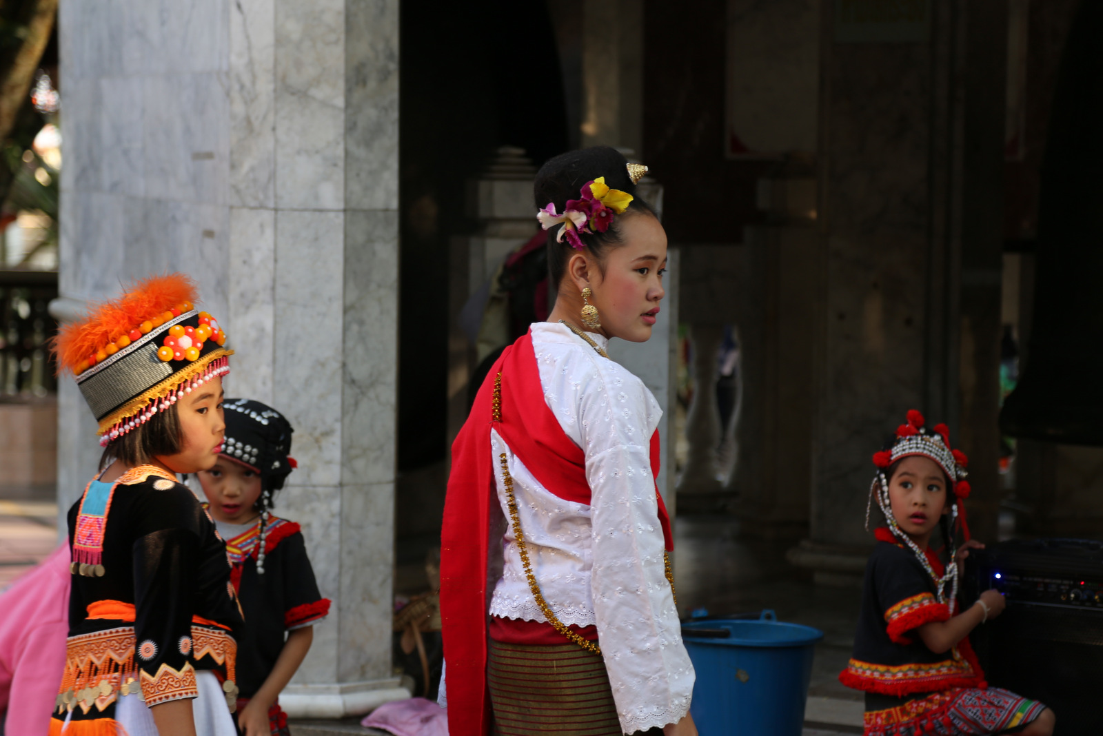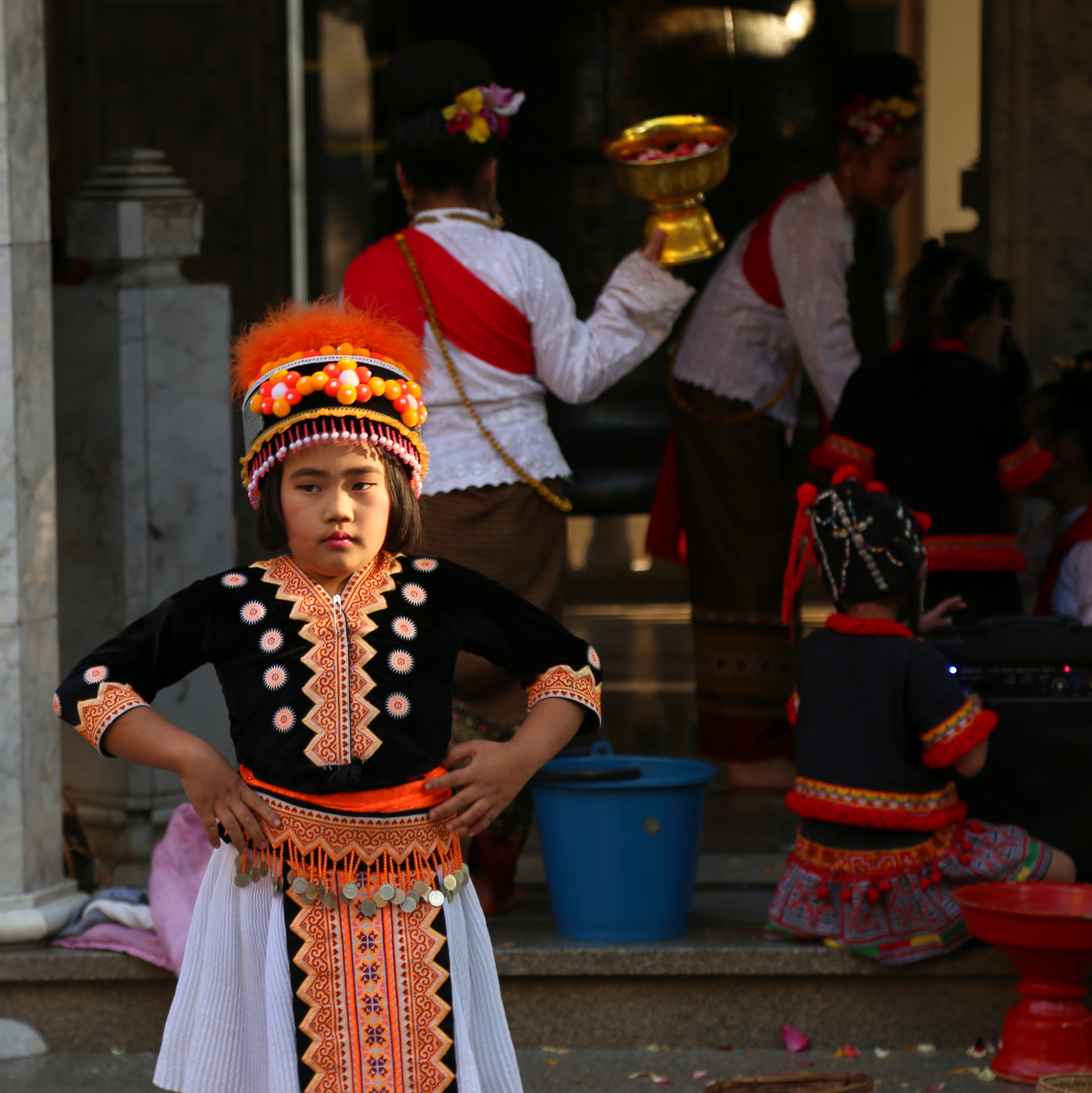 Kiemelyje prie šventyklos sukiojasi etnografiniais kostiumais pasipuošusių vaikų būrelis – matyt, ruošiasi kažkokia ceremonijai, kažko laukia, o tuo tarpu užsiima savo vaikiškais reikalais.