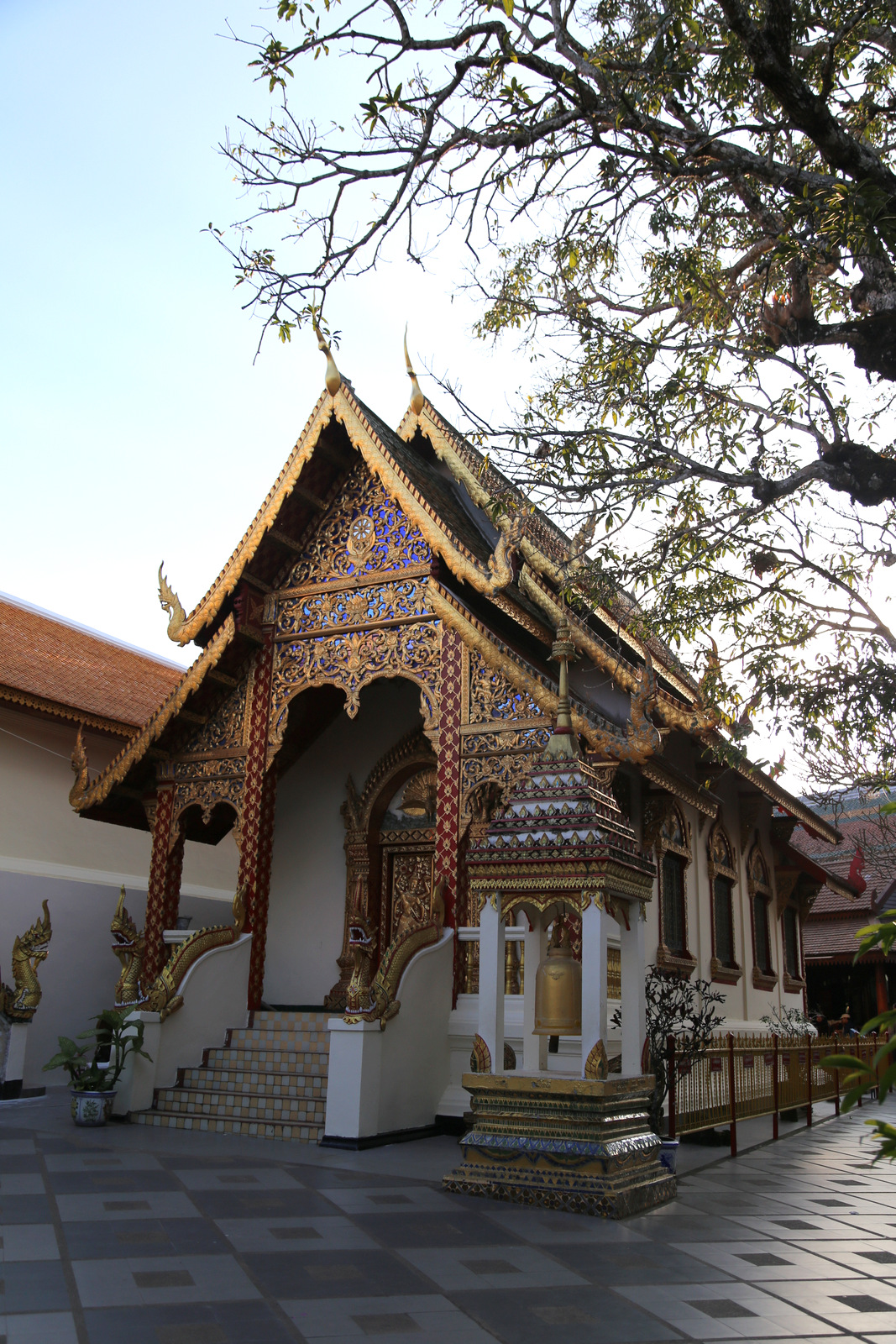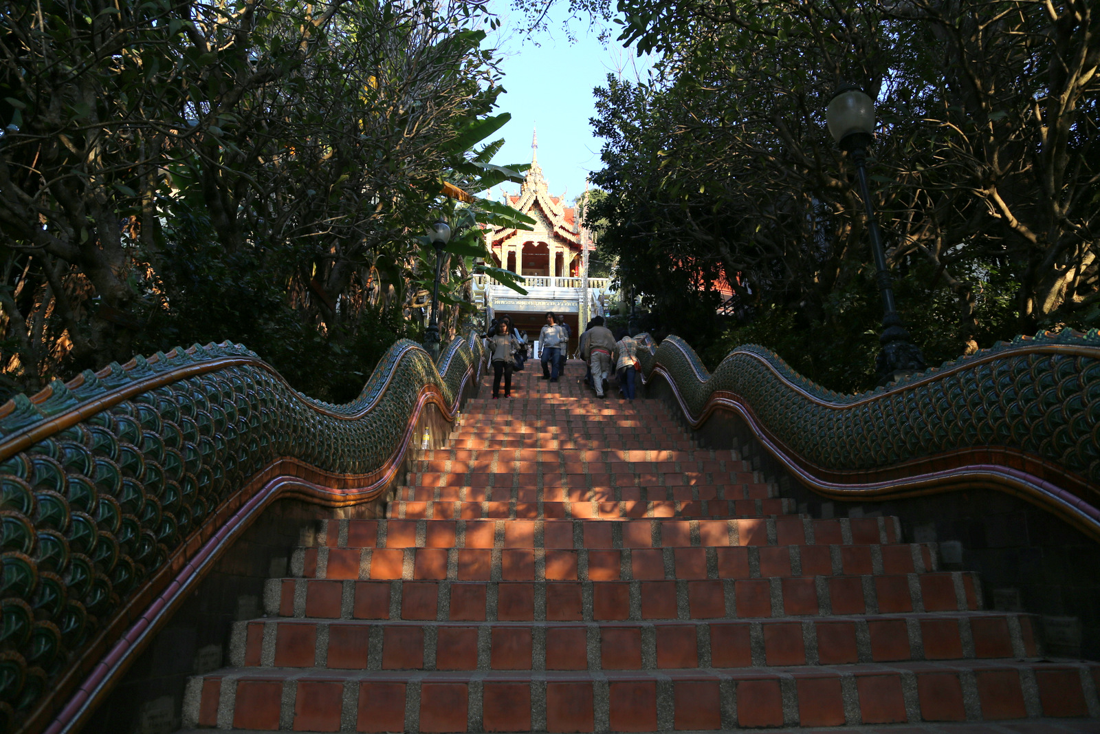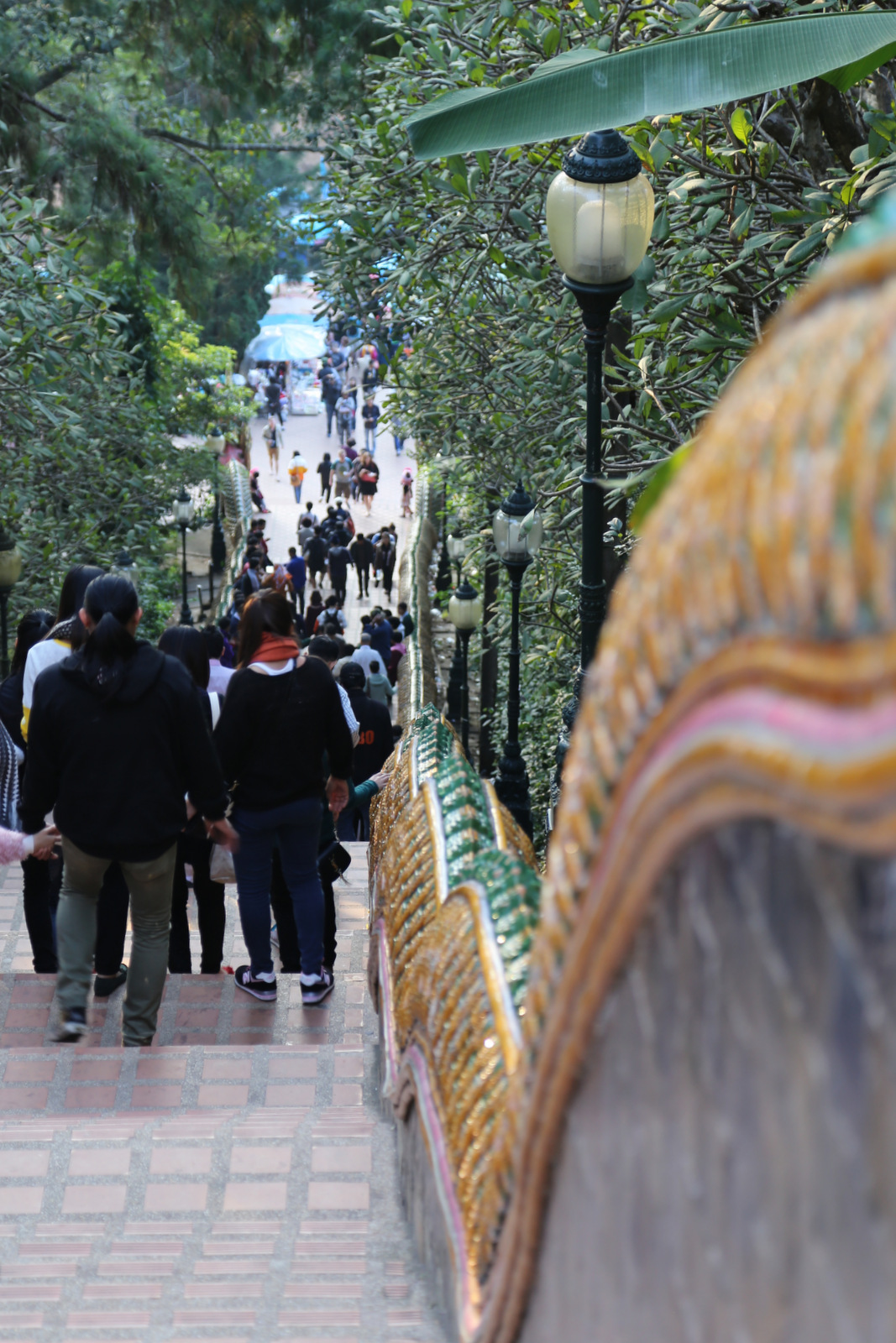 Kitas sustojimas – Doi Suthep šventykla. Tajai sako, kad jei buvai Chiang Mai ir neaplankei Doi Suthep, tai kaip ir nebuvai. Šventykla stovi kalvos viršūnėje, į ją veda statūs akmeniniai laiptai. Jais lipti tingime, taiga renkamės funikulierių. Prie jo išsirikiavusi didžiulė eilė, tiek vietinių, tiek ir turistų (vietinių, ko gero, daugiau), bet ji juda greitai, laukiam gal 15 minučių, į viršų traukinukas užveža per kelias minutes.