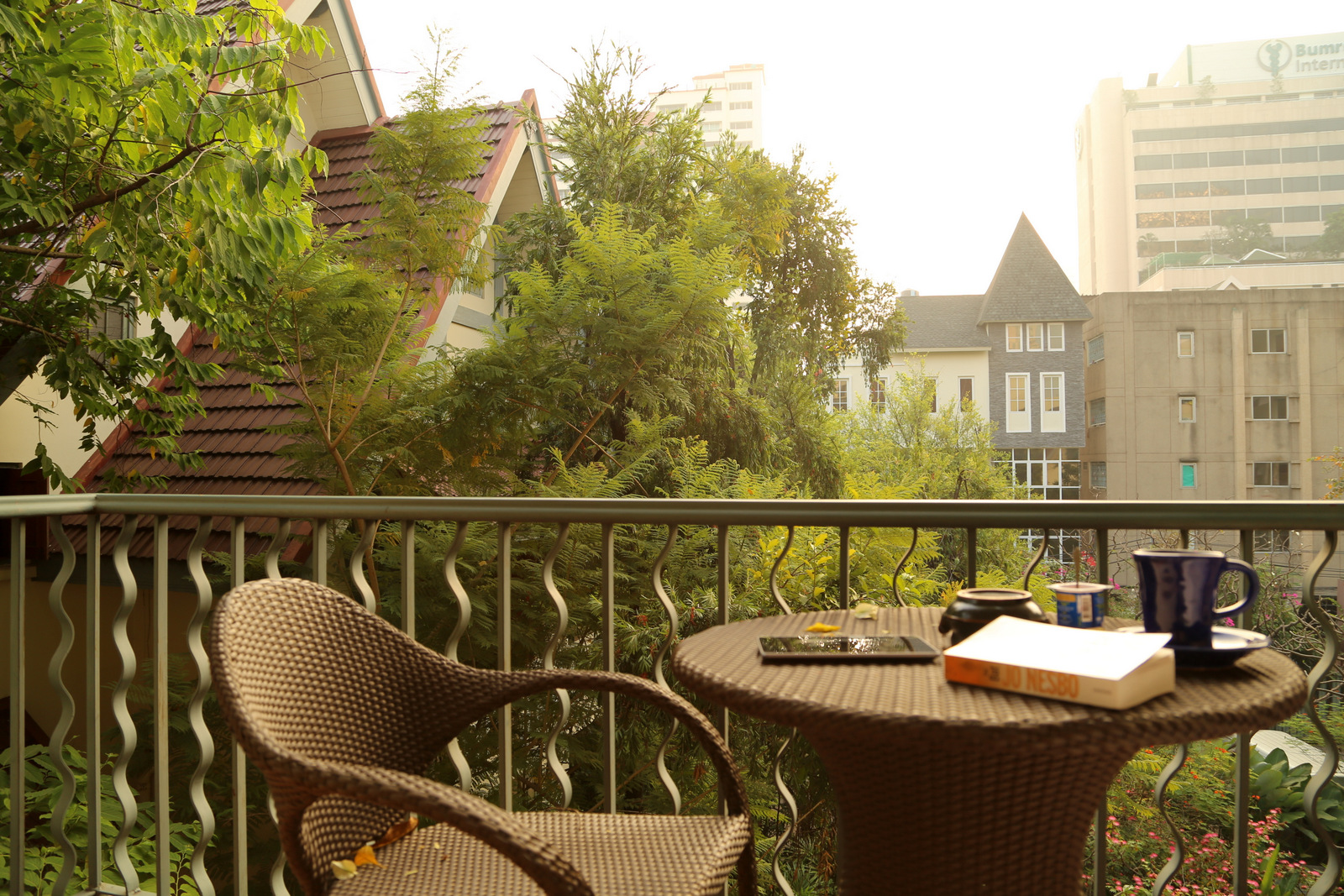 Po Koh Samui laukė paskutinis kelionės etapas – grįžimas namo. Buvo suplanuota dar viena nakvynė Bankoke (skrydis į Amsterdamą – dvyliktą valandą, iš Koh Samui tą pačią dieną nespėtume grįžti). Šįkart pasirinkome Ariyasomvilla – labai jaukų viešbutį Sukhumvit rajone, įsikūrusį mažytėje žalioje oazėje pačiame miesto centre. Viešbučio kambariai išsimėtę per kelis daugiau nei šimto metų senumo pastatus, juos supa vešlus žalias sodas. Sunku patikėti, kad visai čia pat – šurmuliuojantis milijoninis miestas, greitkelis, dangoraižiai. Viešbutyje atsiradome ankstyvą popietę ir ketinome dar ką nors nuveikti Bankoke. Deja, planus sugriovė sustreikavęs mano skrandis – jau nuo ryto jį maudė, o po pietų pradėjo skaudėti taip, kad galėjau tik gulėti, ryti vaistus ir laukti, kol praeis. (Ačiū Facebook draugams, padėjusiems susigaudyti, kokių vaistų ieškoti, nes manieji kaip tik buvo pasibaigę.) Taigi nieko daugiau Bankoke pamatyti neteko. Kitą rytą, laimei, atsibudau su gerokai aprimusiu skrandžiu – daugiau nei dešimties valandų skrydis į Amsterdamą jau nebeatrodė toks baisus. O iš viešbučio teprisimenu tik žalios oazės betono džiunglėse įspūdį. Paskutinį rytą sėdėdama balkonėlyje galvojau, kad jei reiktų gyventi miesto bute, tai norėčiau va tokios žalumos aplinkui.