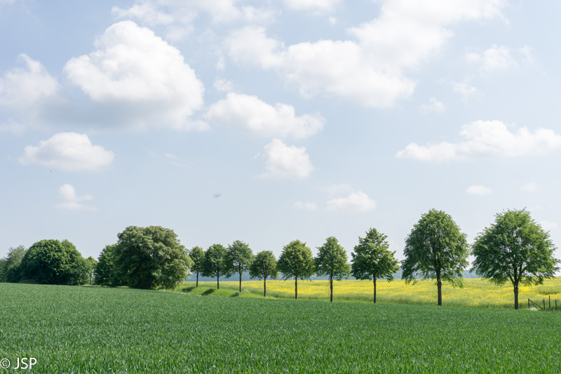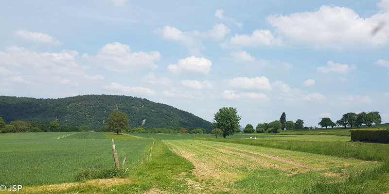 Pastatę mašiną Unkelio pakraštyje, takeliu per mišką kylame aukštyn. Diena graži, lengvai debesuota, nekaršta – tobulas oras žygiui. Netrukus užkopiame į plačią lygumą virš upės ir kurį laiką einame asfaltuotu keliu pro laukus.