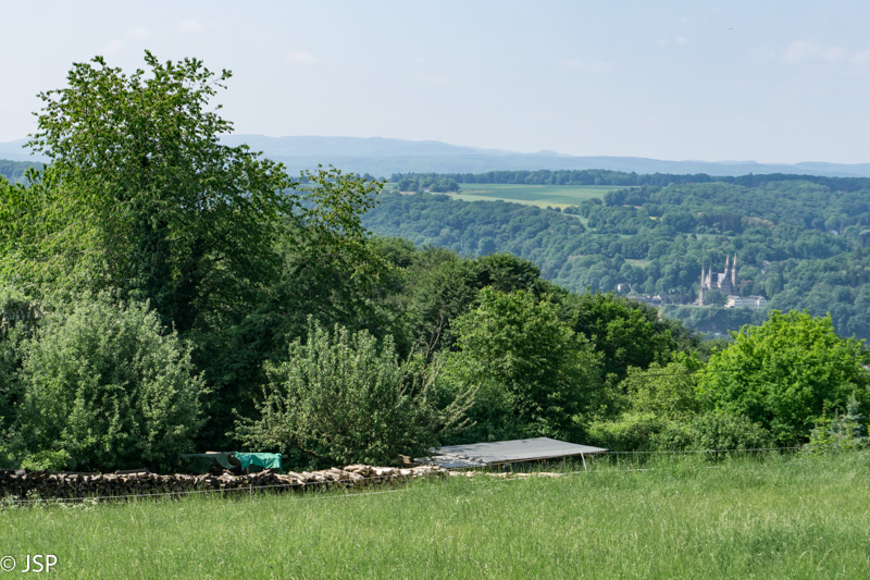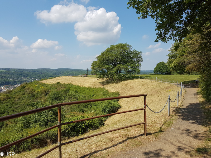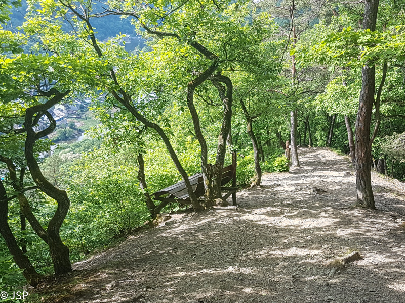 Laukai baigiasi, prasideda miškas – pačiu laiku, nes jau norisi pavėsio. Netrukus pasiekiame Erpeler Ley – ant aukšto skardžio virš Reino esančią apžvalgos aikštelę su plačiais vaizdais.