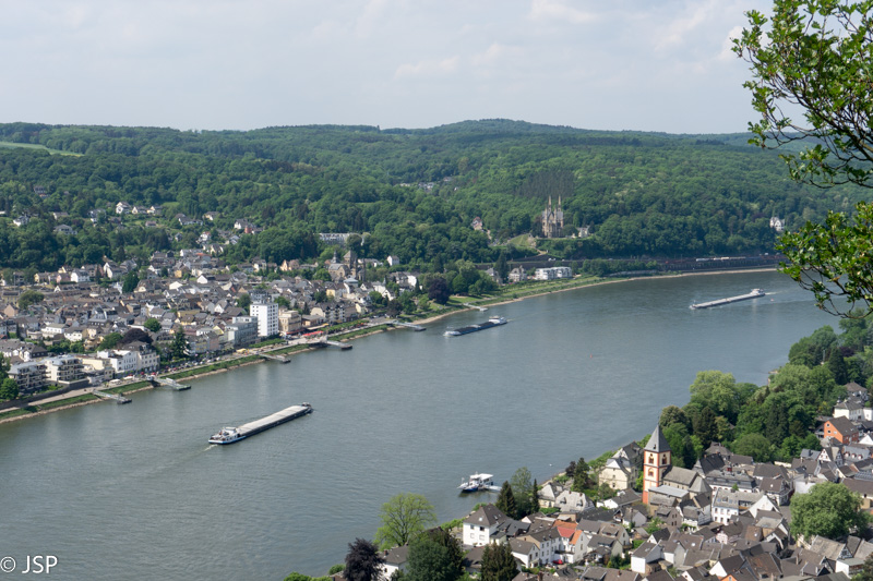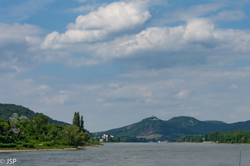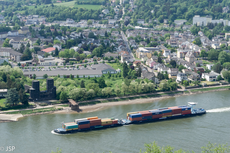 Reinu ištisai plaukia didžiulės baržos. Kitoje pusėje matosi Remagen tilto liekanos – tiltas buvo sugriautas Antrojo pasaulinio karo metu, kuomet šiame regione vyko aršūs mūšiai.