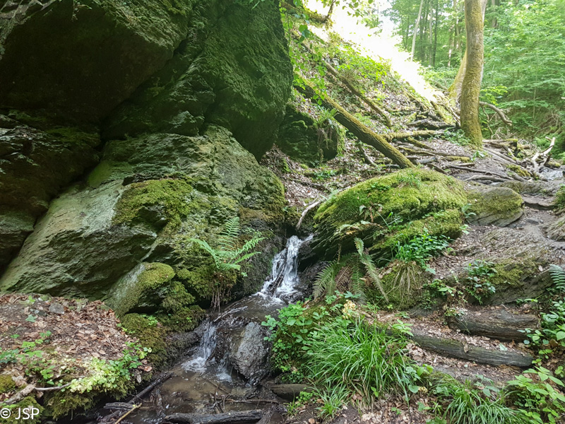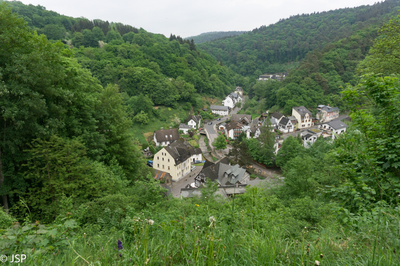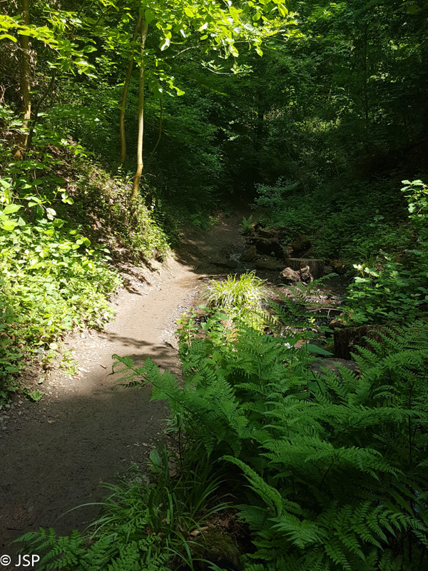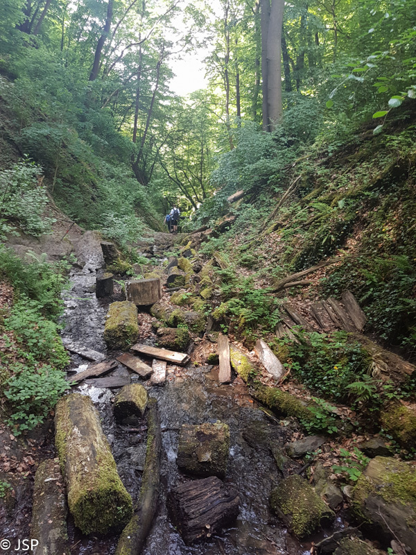 Nusileidimas iš pradžių gana status, vietomis beveik čiuožiame žemyn pernykščiais lapais nuklotais miško takeliais. Paskui takas kiek išsilygina ir galiausiai išveda mus į Erpelio pakraštį. Erpeler Ley liko štai ten aukštai, miškingo skardžio viršuje.