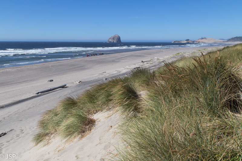 Po Cape Lookout žygio užsukame papietauti į mažą pajūrio kaimelį skambiu pavadinimu Pacific City ir smėlio pusiau užneštomis gatvėmis, o paskui stojame Nestucca iškyšulio parkinge ir einame pasivaikščioti palei vandenyną. Pasvarstome variantą apeiti visą iškyšulį Nestucca Spit Loop trasa, bet 12 kilometrų mums pasirodo daugoka, juolab šiandien jau įveikėme 8 kilometrus Cape Lookout iškyšulyje. Galiausiai nusprendžiame tiesiog eiti pliažu tolyn, kol pavargsime, o tada sukti atgal.