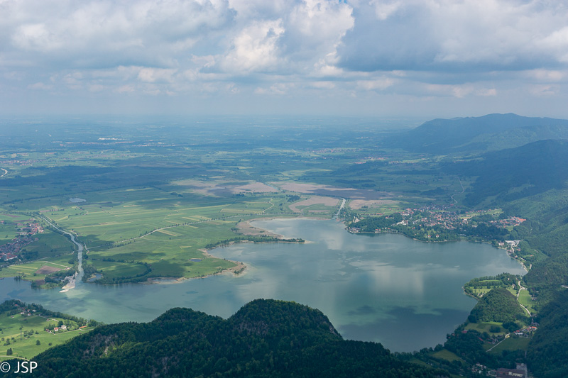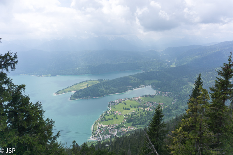 Walchensee saulėta ir šilta, bet viršuje pasitinka visai kitoks oras – vėsu, pučia žvarbokas vėjas, iš visų pusių ežerą apstoję kalnai užgulti tamsių debesų, matomumas prastas. Bet net ir tokiomis oro sąlygomis ežeras toli apačioje labai gražus.
