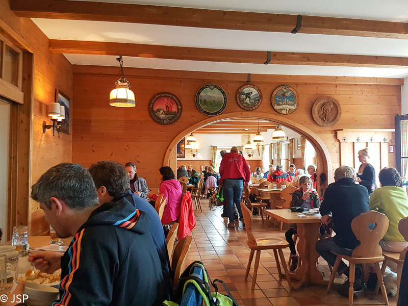 Vaizdingu ir lengvu takeliu einame į netolimą Herzogstand kalnų trobelę – ten pavalgysime ir sugalvosime, kurią trasą pasirinkti šios dienos žygiui. Viduje sausakimša, bet mums pasiseka – randame paskutinį laisvą staliuką ir netrukus jau dorojame bulvinius blynus ir špinatų kukulius, o pavalgę imamės kurti veiklos planą.
