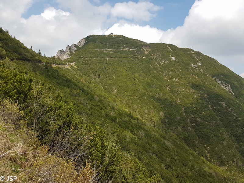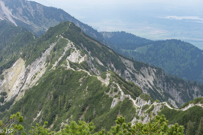 Variantų iš esmės trys – kopti į netoliese esančią Herzogstand viršukalnę (nelabai sunkus serpantinų takas), eiti į tolimesnę Heimgarten viršukalnę (puiki trasa kalnų keteromis, bet žygis truktų mažiausiai penkias valandas, o ir trasa juoda, nes ketera tarpais labai siaura ir iš abiejų pusių status šlaitas), arba leistis žemyn į slėnį (pora valandų labai stačiu taku). Pasirenkame kopti į Herzogstand – jei paskui dar bus laiko ir jėgų, galbūt apsigalvosim dėl to žemyn į slėnį vedančio tako, nors šiuo metu jis mūsų nevilioja.