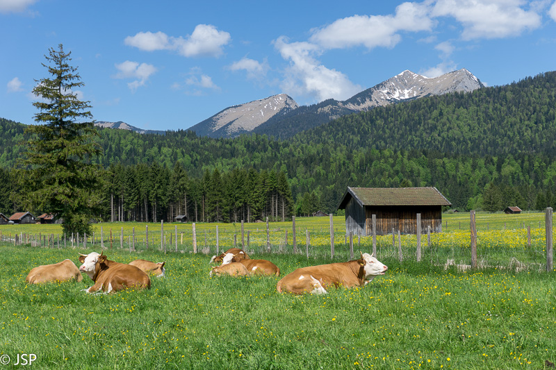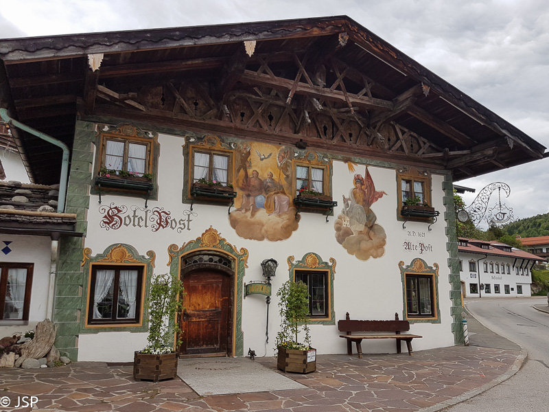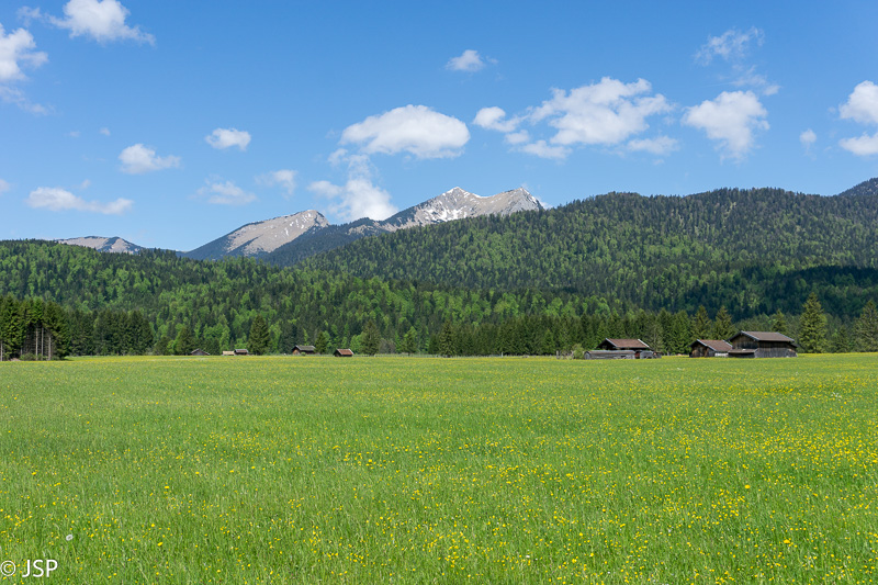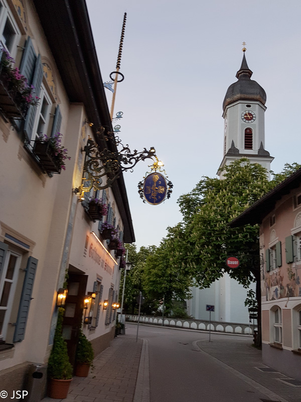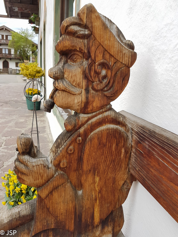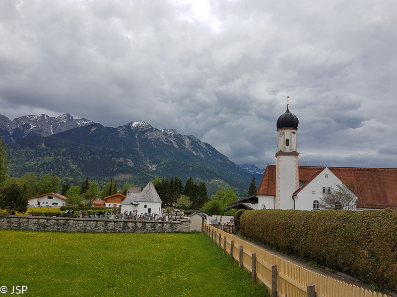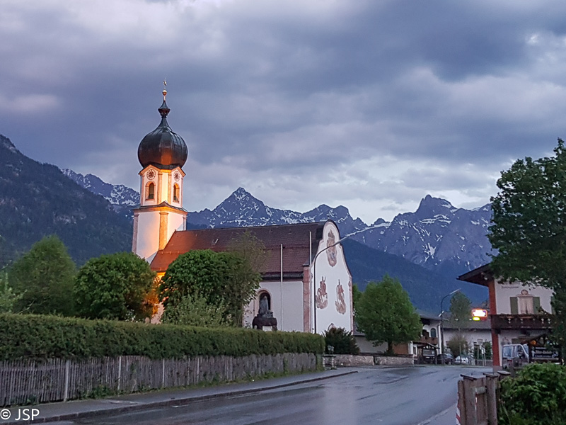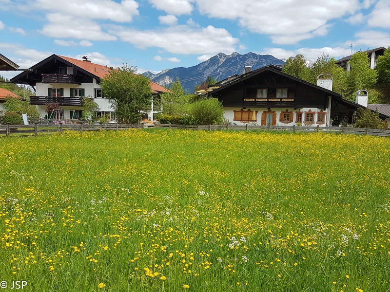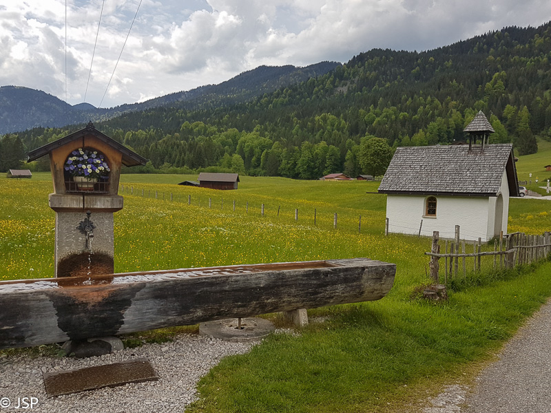Susinešę vidun lagaminus, važiuojame pasidairyti ir užsipirkti maisto. Edeka supermarketas tik už kilometro – nedidelis, bet yra viskas, ko mums reikia. Dar už poros kilometrų – Wallgau, jaukus tradicinis bavariškas kaimelis, su gausiai piešiniais išdabintomis namų sienomis, į dangų besistiebiančiu nedidelės bažnyčios bokštu, prisėsti kviečiančiais smagiais drožiniais papuoštais suoliukais skverelyje ir iš visų pusių besiveriančiomis kalnų panoramomis. Wallgau ir Krün kaimai nutūpę plačiame slėnyje Karwendel Alpių masyvo pakraštyje, vaizdai čia puikūs, net ir tokią pilką dieną kaip šiandien. Susižavėjusi dairausi aplink, geriu į save tyrą kalnų orą ir jau laukiu rytdienos – turėtų būti saulėta, norisi pamatyti kalnus ir žydinčias kalnų pievas visame jų grožyje. Šiandien apniukę ir žvarboka, dar ir lietus krapnoti pradeda, bet nebėda – visai šalia užsukti kviečia konditerijos iškaba, tad ilgai nelaukę smunkam vidun. Karštos arbatos puodelis ir didelis gabalas lengvo kaip pūkas avietinių putėsių torto kaip mat sušildo ir pataiso nuotaiką. Pasmaguriavę užsisakome staliuką Post viešbučio restorane kitoje gatvės pusėje, ir grįžtame į savo namuką pailsėti prieš vakarienę.