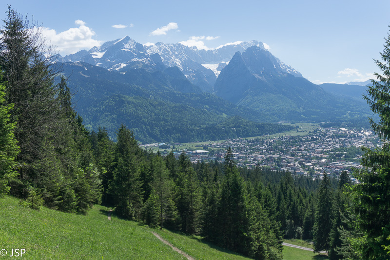 Saulė tuo tarpu vis labiau kaitina, dangus toks mėlynas, kad beveik akis skauda. Takas vingiuoja tolyn per mišką ir kalnų pievas, tolumoje jau matosi Garmisch, nusidriekęs slėnyje ir padengtas nuo karščio raibuliuojančia lengva migla. Nusileidimas nuo Wank viršūnės iš viso užtrunka kiek daugiau nei tris valandas, per daug nepavargstame ir šiuo žygiu liekame labai patenkinti.