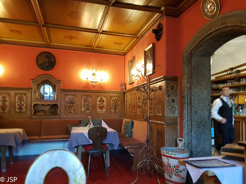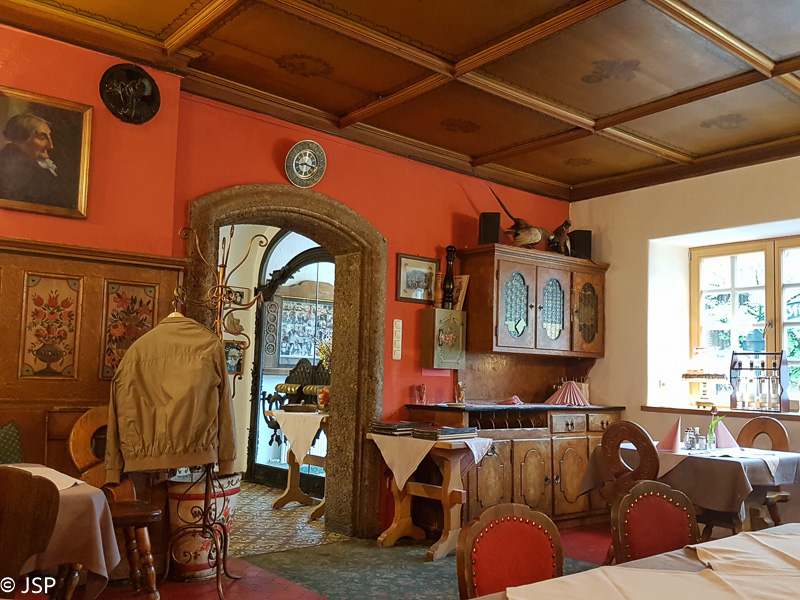 Iki restorano ketinome pasivaikščioti (juk tik 3 km į vieną pusę), bet vakarop žadėjo lietų, taigi važiuojame mašina. Viduje mus pasitinka jaukus bavariškas interjeras, smarkiai vyresnio amžiaus padavėjai, beveik nekalbantys angliškai, bet labai draugiški ir paslaugūs, labai greitas aptarnavimas ir didžiulės porcijos. Aš savosios neįveikiu ir labai nustebinu padavėją pasakiusi, kad per daug – „kaip gali būti per daug“, matau nebylų klausimą jo akyse, bet nieko nesako ir nusišypsojęs nusineša lėkštę, kurioje likusio maisto dar bent dviems žmonėms užtektų. Deserto meniu jau net nebeatsiverčiu – nebetilptų niekaip.