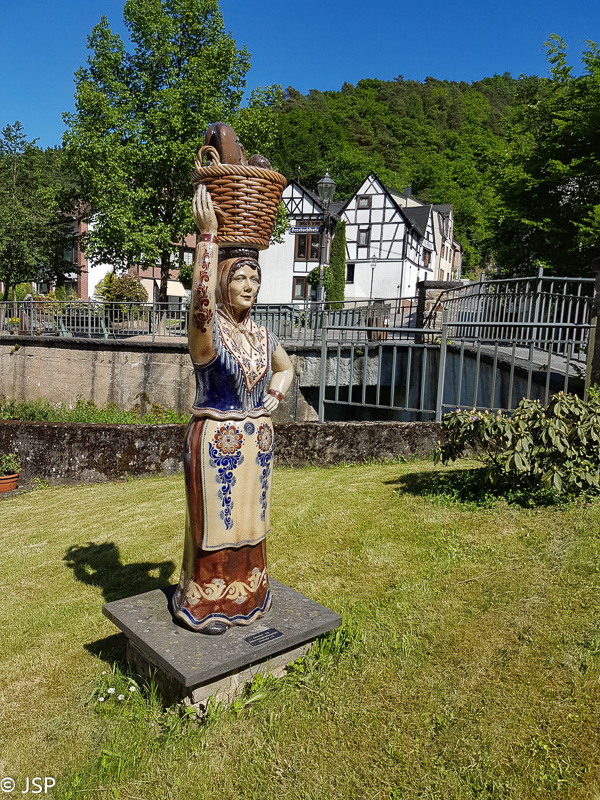 Vėl grįžę į Grenzau dar trumpai pasidairome po tuščias gatveles – vietiniai turbūt visi pasislėpę nuo karščio, tik keli turistai sėdi kavinėje po skėčiais nuo saulės. O miestelis labai jaukus, padabintas keramikos dirbiniais (artimiausiame mieste yra keramikos mokykla – jos studentų darbai eksponuojami kaimelio gatvėse).