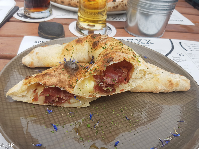 Apie dvyliktą valandą grįžtame į viešbutį ir einame pietauti į piceriją – laikas patikrinti, ar tikrai tos picos panašios į neapolietiškas. Ir žinote ką? Jos tikrai puikios! Na gal ir ne visiškai tokios kaip Neapolyje, bet nelabai daug atsilieka. Ypač skani pusmėnulio formos calzone, patiekiama perpjauta pusiau. Aš net nežinojau, kad užsisakiau picą – pagal patiekalo pavadinimą galvojau, kad bus kažkas panašaus į lavašą su kumpiu ir sūriu. Gavau visai ne tai, ko tikėjausi, bet buvo labai labai skanu!