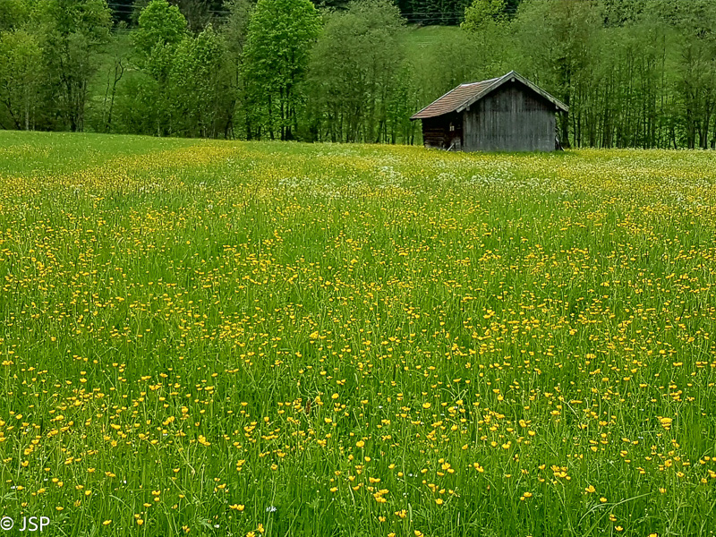 Kitame ežero gale – mažutukas Gerold kaimelis. Čia kryžiuojasi daug pėsčiųjų trasų, viena iš jų – per žydinčią pievą iki tolyje dunksančių kalnų – atrodo ypač viliojančiai, bet mums šiandien nepakeliui. O gaila!