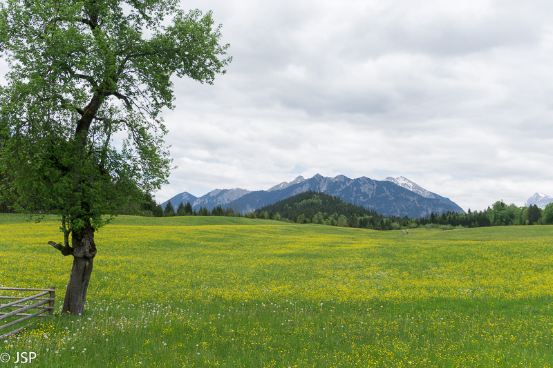 Kelias geras, su gražiais vaizdais, bet be proto vingiuotas, o posūkiai tokio staigumo, kad norisi ištisai stabdį spausti – bet iš paskos ir taip jau velkasi netrumpa „uodega“, tad drąsinu save ir mėginu bent jau priartėti prie pakelėje nurodyto greičio. Labai „įdomus“ kelias, kai esi dar nepatyrusi vairuotoja! Pagaliau pasiekiame posūkį į Ettal ir Linderhof. Beveik tuščias kelias vingiuoja per idilišką Ettal slėnį, iš visų pusių mus supa geltona pavasarinių gėlių jūra, besidriekianti iki pat miško ir horizonte stūksančių kalnų. Netrukus stabtelime pakelės kavinukėje papietauti. Sėdime lauke, nes oras laikinai pasitaisė, tarp debesų švysčioja saulė, nors ir vėsoka.