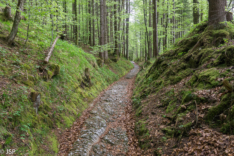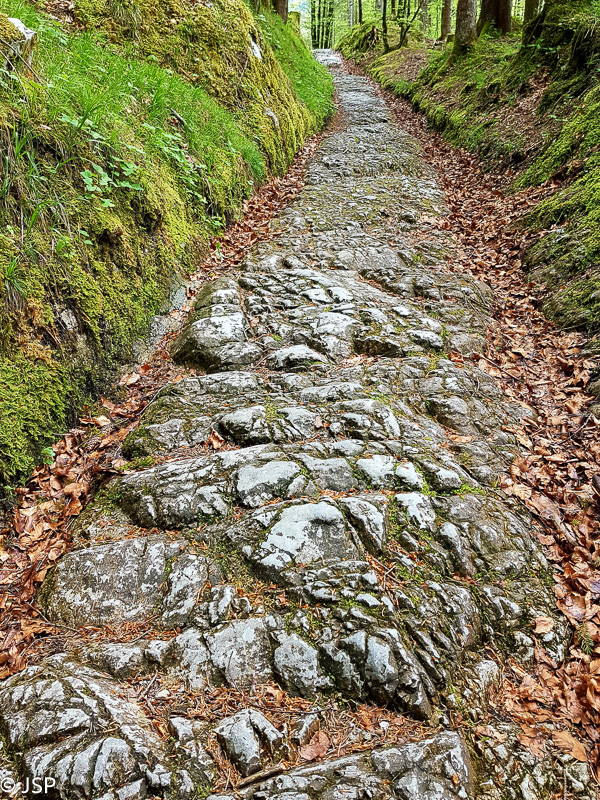 Trasos liko nebedaug, gal pora kilometrų, o mes jau šiek tiek pavargę, norėtųsi kur nors išgerti arbatos ir atsipūsti. Užmatome svečių namus ir kavinukę netoliese, bet pakeliui pasipainioja ženklas į romėniško kelio – Via Raetia – liekanas. Iki jo tik pora šimtų metrų. Einam! Tikrai, miško pakraštyje mus pasitinka tarp dviejų šlaitų vingiuojantis prieš beveik du tūkstančius metų akmenų luitais išgrįstas keliukas – tokio pločio, kad pravažiuotų arklių ar jaučių traukiamas vežimas. Abiejose pusėse matosi gilios provėžos – informacinis stendas sako, kad tai daugybė vežimų kažkada taip akmenis nugludino. Einame tuo keliu-takeliu gal pusę kilometro, kol jis nepasibaigia ir vėl nepavirsta paprastu miško taku. Jausmas fantastiškas – tarsi būčiau prisilietusi prie tūkstantmetės istorijos, eidama tuo pačiu keliu, kuriuo prieš tūkstančius metų riedėjo pirklių vežimai ir kurį galbūt mindė romėnų legionierių sandalai.