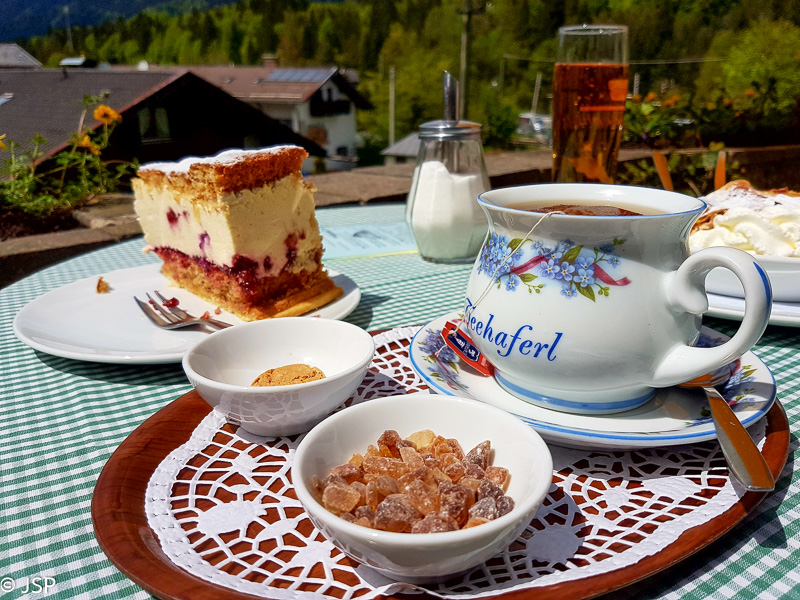 Aplankę Via Raetia, grįžtame į Klais ir dabar jau tiesiu taikymu einame į kavinukę. Prisėdame lauko terasoje su vaizdu į kalnus. Aš užsisakau puodelį arbatos ir naminio torto gabaliuką. Tiek arbatos puodelis, tiek torto porcija – bavariško dydžio. Labai skanus tortas, bet niekaip jo neįveikiu. Padavėja juokiasi, kad reikėtų specialių, mažesnių, porcijų turistams. Aš šypsausi ir sau tyliai galvoju, kad visai rimtai, reikėtų!