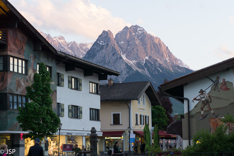 Vakarienės važiuojame į Garmisch – visai netoli, mažiau nei pusvalandis labai vaizdingu (ir labai vingiuotu) keliu per kalnų slėnį. Garmisch – jaukus miestukas, aprėmintas aukštų snieguotų viršukalnių, smagu čia pasivaikščioti dienai baigiantis, ypač kai dar ne sezonas ir turistų nedaug.