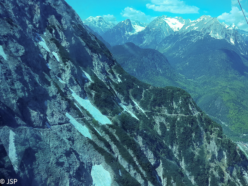 Karwendel keltuvas išvyksta kas pusvalandį, laukti tenka neilgai. Kylant aukštyn per keltuvo langą užmatau kalno šlaitu žemyn vingiuojantį taką – mintis nuo viršūnės pėsčiom leistis žemyn dingsta vos atsiradusi, nes takas labai status, atviras ir sniego daug. Bet vidurvasarį, sniegui nutirpus, gal ir smagus žygis būtų.