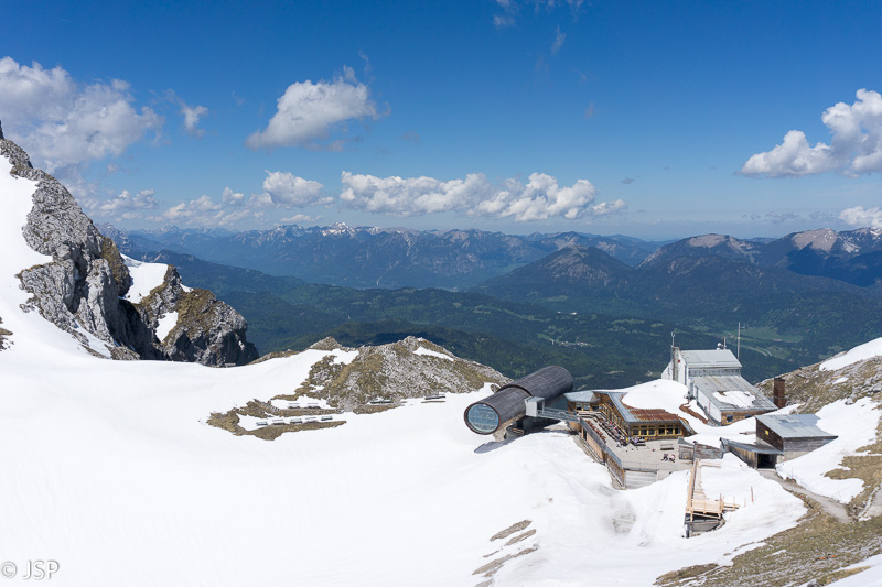Prieš leisdamiesi žemyn sugalvojame papietauti čia viršuje. Kavinukė nedidelė, karštų patiekalų pasirinkimas negausus (visus produktus juk tenka keltuvu atgabenti), bet vaizdai nuo lauko terasos puikūs, o grynas kalnų oras žadina apetitą. Aš išsirenku labai vokišką patiekalą – pakeptą dešrą su raugintais kopūstais. Atrodo nelabai kaip, bet skanu ir sotu.