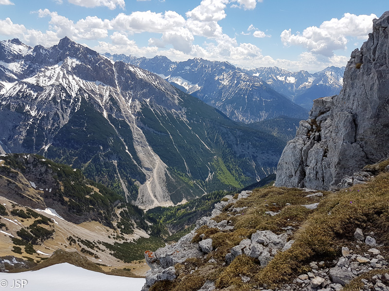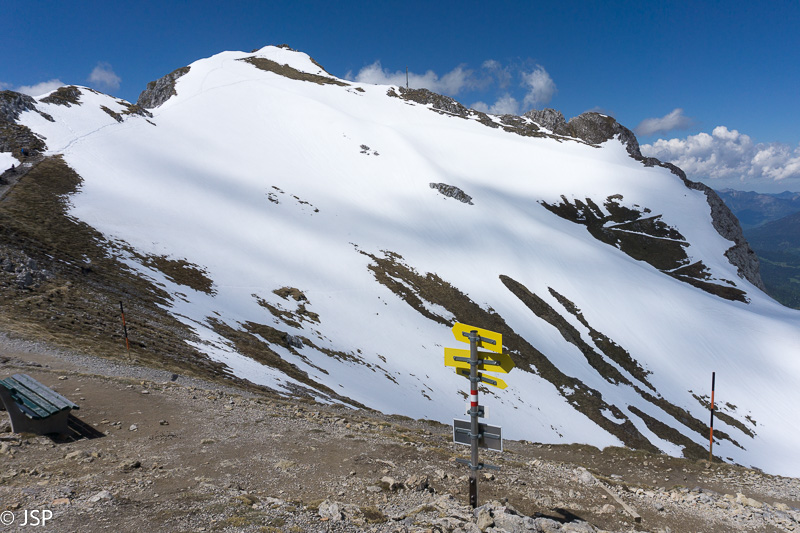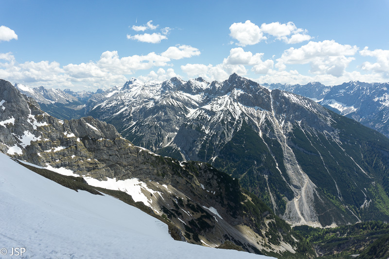 Kitoje sniego kliūties pusėje – pėsčiųjų trasų rodyklės, keliolika turistų, keletas žygeivių su rimta įranga, ir svaigūs vaizdai nuo kalno keteros į slėnį kitoje pusėje. Esame pačiame Vokietijos ir Austrijos pasienyje, Tirolis visai šalia!
