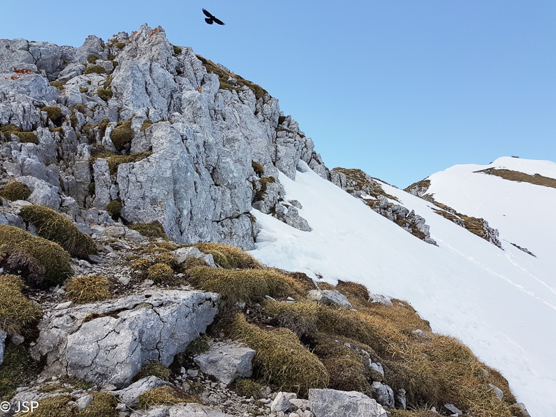 Atsisukus į kalno pusę, pribloškia sniego gausa. Žinojau, kad jo bus, bet kad tiek… Visai šalia keltuvo stoties prasideda valandos trukmės panoraminis takas, žadantis puikius vaizdus, bet šiandien juo praeiti neteks – šlaitus nugulęs storas sniego sluoksnis, tako po sniegu beveik ir nebesimato. Tiesa, galima nesunkiai pasiekti tolimąją keterą kitoje nedidelio slėniuko pusėje, bet net ir tam reikės pereiti netrumpą sniego ruožą – o mes tik dabar apsižiūrime, kad trekingo lazdas palikome apačioje, mašinos bagažinėje! Tenka eiti lėtai ir atsargiai, nes sniego takas labai slidus, bet įveikiame jį visai nesunkiai.