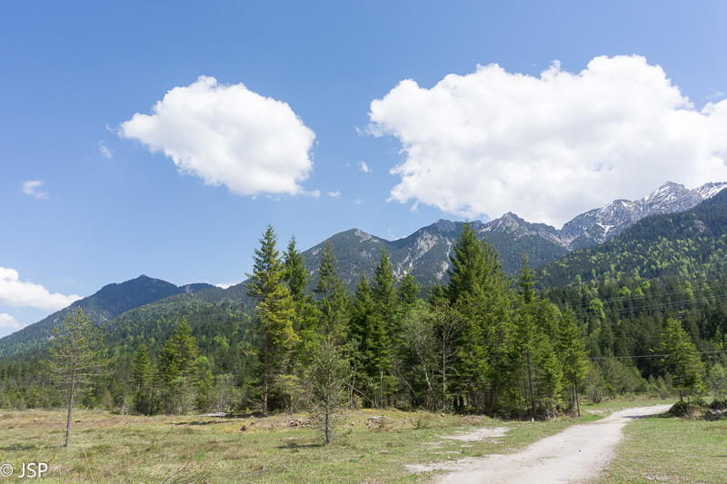 Pusiaukelėje tarp Wallgau ir Krün užmatome nuorodą į žygeiviams skirtą parkingą. Jis tik už kelių šimtų metrų nuo plento. Nemaža aikštelė šalia smarkiai nusekusios kalnų upės, šalia tilto – pėsčiųjų trasų žemėlapis ir stulpas su daugybe nuorodų. Žygiai įvairaus ilgio ir sudėtingumo. Mes susigundome nesudėtinga kelių kilometrų žiedine trasa per mišką ir upės pakrante – be jokio ypatingo tikslo, tiesiog kojas pramankštinti ir grynu oru pakvėpuoti.