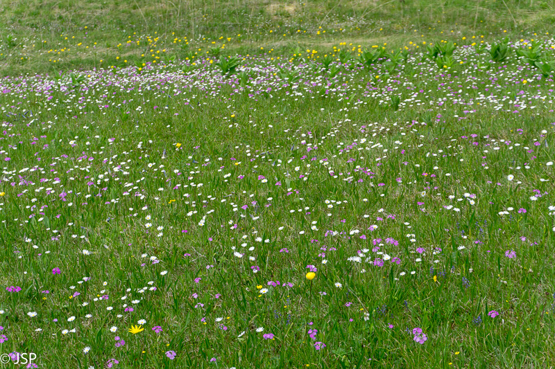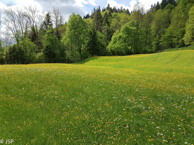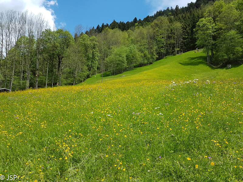 Išėję iš namų ir siaura gatvele nusileidę žemyn, prie posūkio aptinkame lentelę su žygių kryptimis, susirandame savąjį (mūsų maršrutas yra trijų skirtingų maršrutų kombinacija) ir traukiame keliuku per slėnį, tarp geltonai žydinčių kalnų pievų, palydimi beveik lietuviškai atrodančio kryžiaus pakelėje ir smalsiai stebimi tingiai atrajojančių karvių.