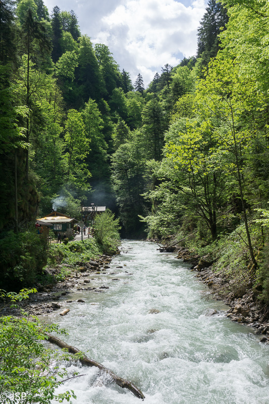 Planas B gimsta greitai – važiuosime apžiūrėti Partnach tarpeklio. Jis visai čia pat, kitoje Garmisch pusėje, gal 10 minučių teužtrunkame pasiekti parkingą. Šalia parkingo – olimpinis stadionas, pastatytas dar 1935-aisiais. Stadione daug turistų, bet mes neužtrunkame – sportas mus nelabai domina. O iki tarpeklio pradžios dar tenka gerokai paeiti – tikrai daugiau nei kilometrą, o gal ir pusantro. Bet eiti lengva, o vaizdai vis gražėja.