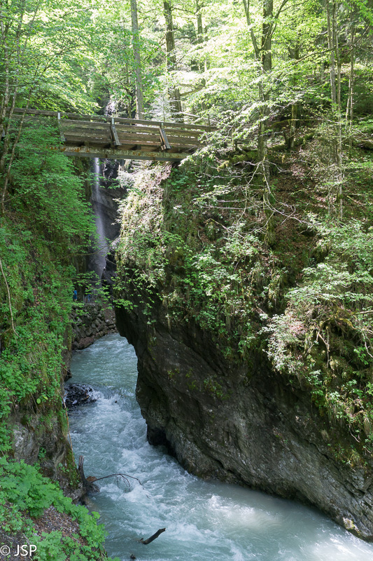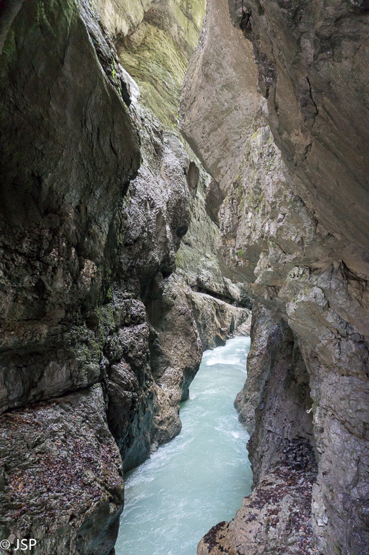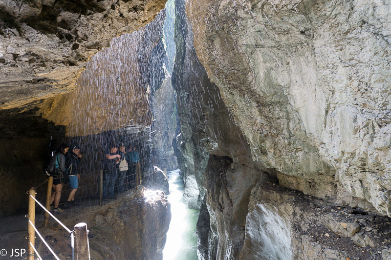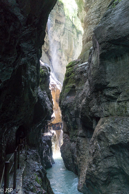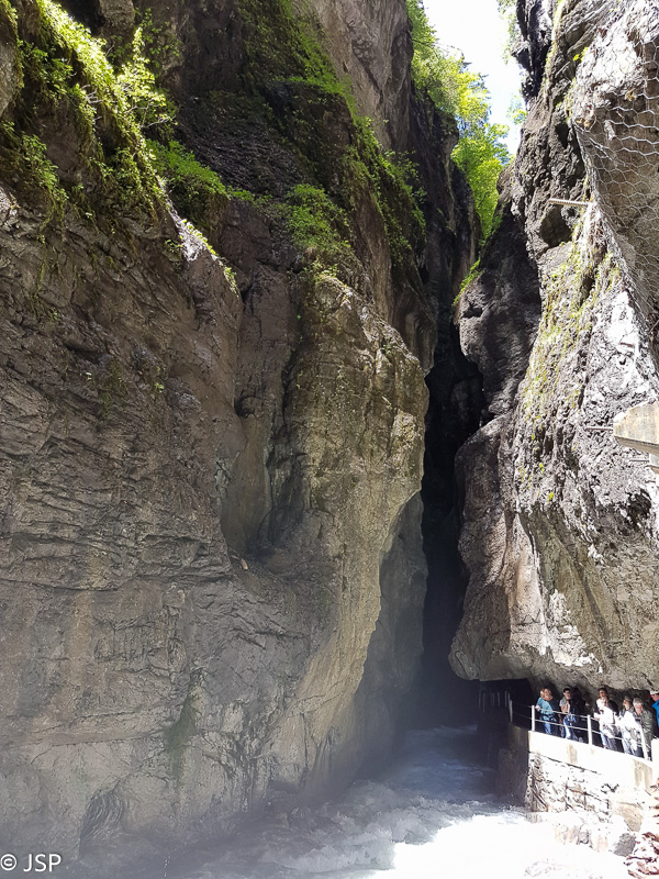 Uolose iškirstu siauru takeliu lėtai einame per Partnach tarpeklį. Žmonių gana daug – sunku įsivaizduoti, kas čia dedasi vidurvasarį, dabar juk dar net ne sezonas, ir eilinė savaitės diena. O tarpeklis tikrai įspūdingas!