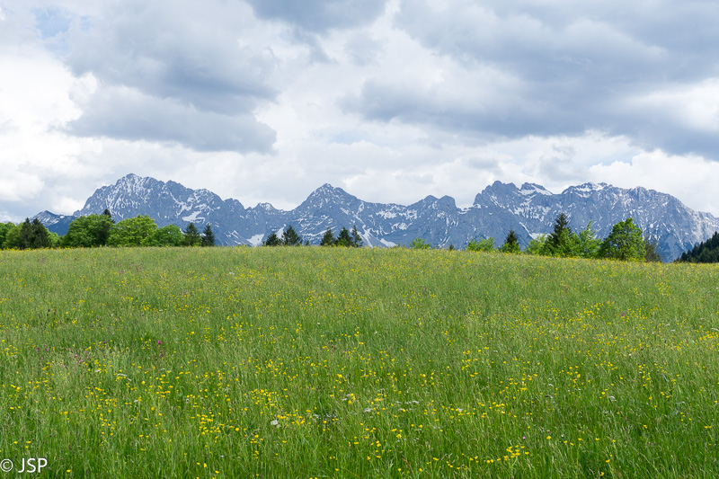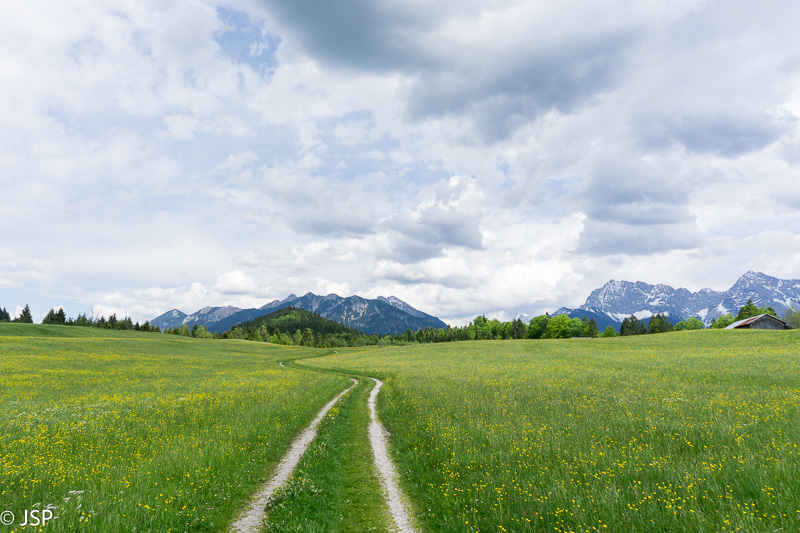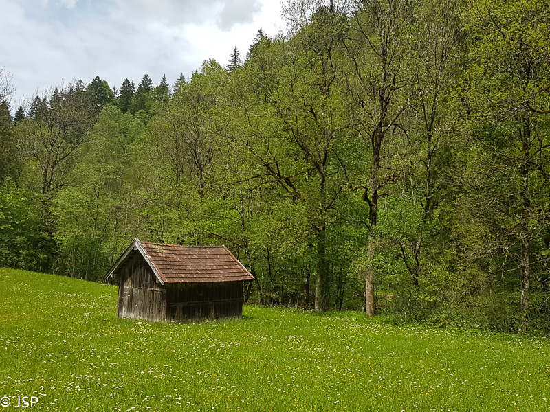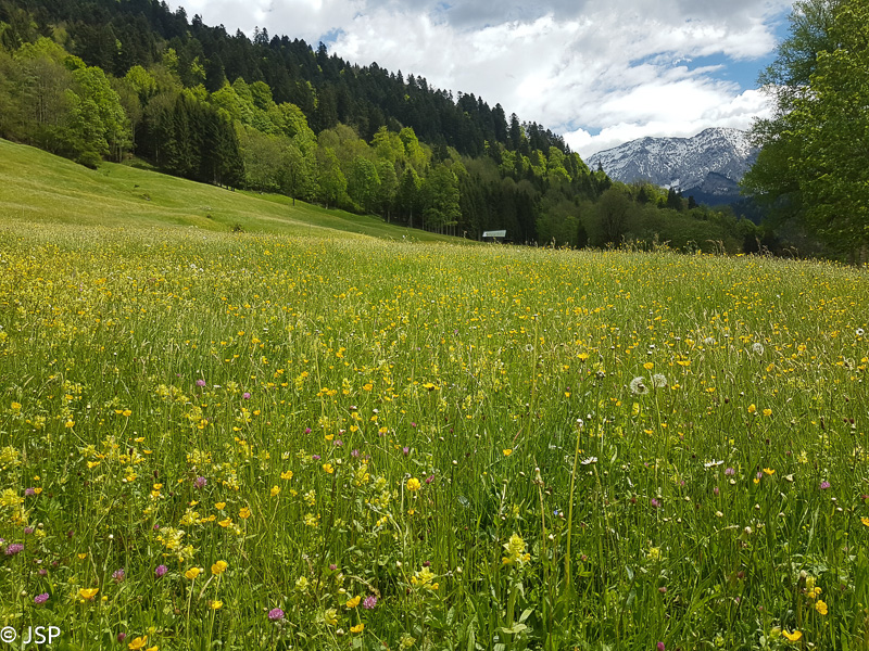 Vėl išlindę į dienos šviesą kitame tarpeklio gale, svarstome, ką veikti toliau. Dar tik dvylikta valanda, laiko turime marias, tik konkrečių planų nelabai. Užmatome prie kelio stovintį stulpą su geltonaisiais trasų ženklais ir einame patyrinėti pasiūlos. Susiviliojame taku, vedančiu aukštyn, į kalnų pievas virš Partnach tarpeklio. Takelis tai toks pagerintas, vietomis labai net status, bet pamažu užpūškuojam aukštyn. Viršuje atsiveria puikūs vaizdai, dėl kurių taip myliu Bavariją – žydinčios pievos, melsvi kalnai, drožiniais ir piešiniais padabinti namukai, mažutės koplytėlės pakelėse. Einam ir gėrimės, ir kalbamės, kaip lengva čia rasti ką nors gražaus – net ieškoti labai nereikia, kur pasisuksi, visur gražu!