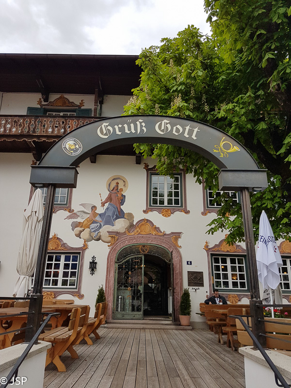 Netrukus prieiname Das Graseck viešbutį. Jis įsikūręs labai gražioje vietoje, su puikiu vaizdu į kalnus, bet pasiekti jį galima tik labai stačiu kalnų keliuku (tokiu stačiu, kad man tikrai nesinorėtų juo važiuoti, ypač žemyn), arba keltuvu iš slėnio, pasistatant mašiną mažame parkinge netoli Partnach tarpeklio pradžios. Net nežinau, ar norėčiau čia apsistoti – bet papietauti būtų puiku, nes jau žarna žarną ryja. Mums pasiseka – gauname paskutinį laisvą staliuką terasoje su tuo nuostabiuoju kalnų vaizdu prieš akis. Maistas irgi labai skanus. Užsisėdime čia ilgiau nei buvome ketinę – nesinori niekur judėti, kai esi tokioje gražioje vietoje.