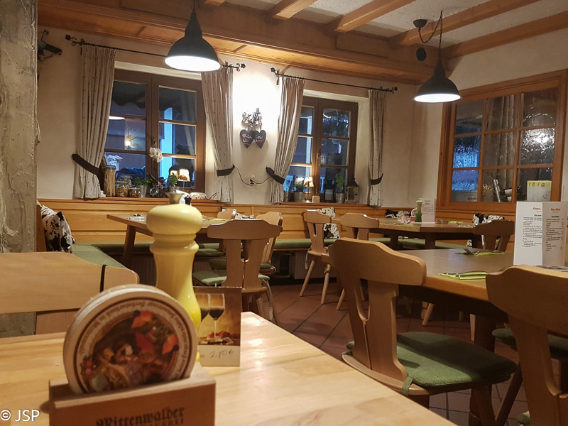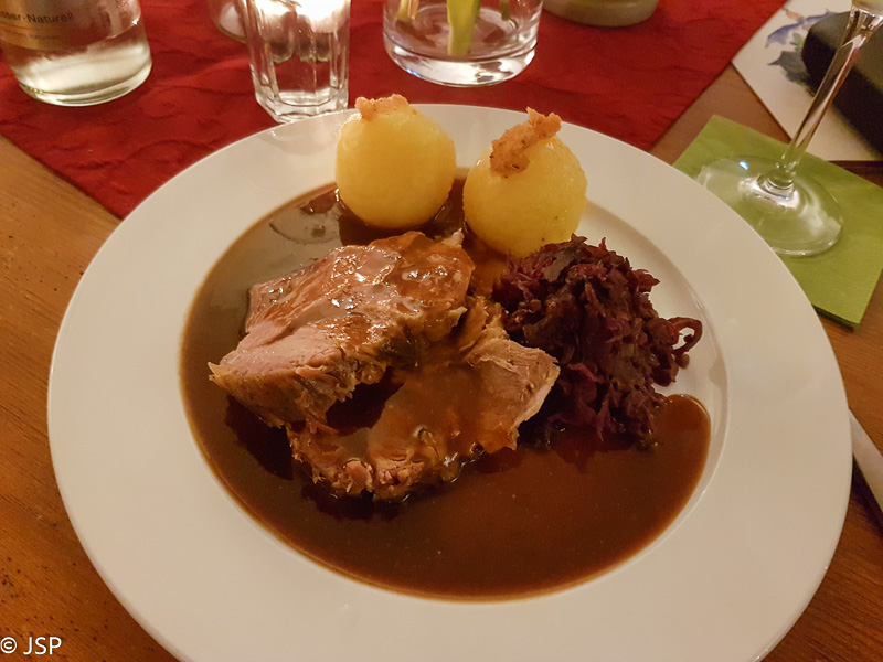 Vakarienės ir vėl važiuojame į Garmisch. Patinka mums šis miestukas, tad jokių kitų variantų ir neieškome. Šįkart renkamės Mohrenplatz. Šalta ir vėjuota, staliukai lauke tušti, o viduje – jaukus bavariškas interjeras, greitas ir paslaugus aptarnavimas ir – taip taip, jau atspėjote! – didžiulės porcijos. Aš užsisakau jautieną su bulvių kukuliais ir raudonaisiais kopūstais. Kukuliai – vos ne cepelinų dydžio, jų vienų beveik užtektų vakarienei!